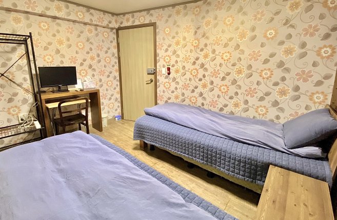 Guest room amenities: Digital door locks (resets when guests check in); bed, cable TV, air conditioner, hangers or wardrobe, window that opens, small table, chair, fire extinguisher, smoke detector, emergency flashlight; and free wireless Internet connections available. All guest rooms are bedrooms and private rooms. We have no dormitory rooms. There are no bathrooms or refrigerators in the rooms.