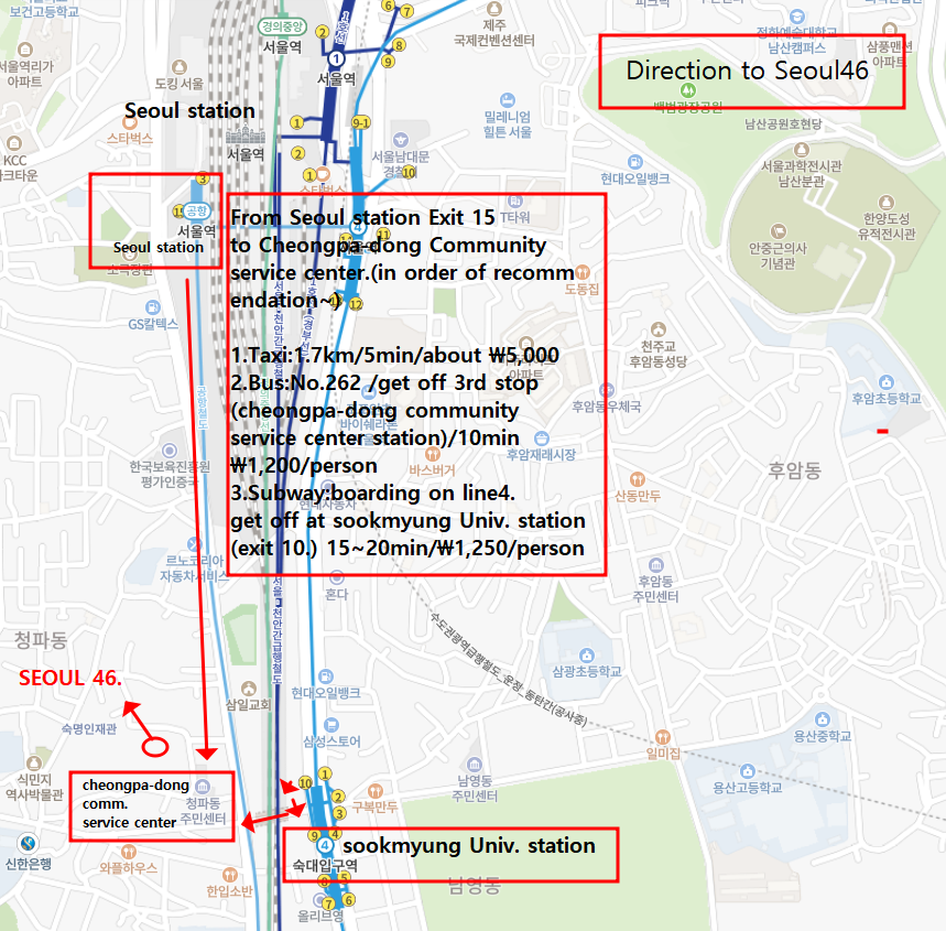 Comfortable and convenient Seoul 46! 1. Located in Yongsan-gu, the center of Seoul. Optimized location for tourism and business. (20-30 minutes by public transportation to major Seoul tourist... See more