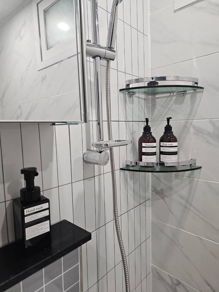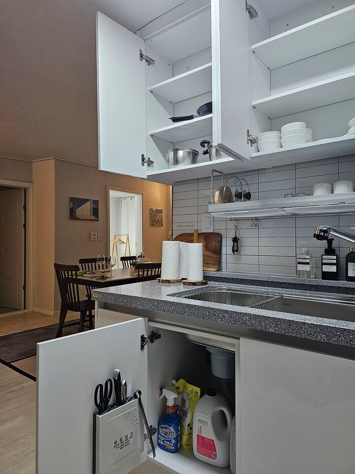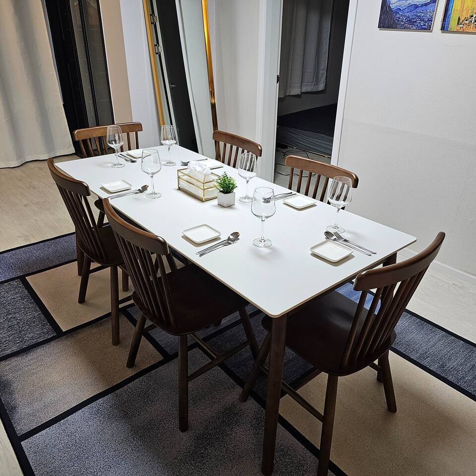 그 외 기본적인 생활필수품이 구비되어 있으며 고급 매트리스와 깨끗한 침구류를 제공합니다. 거실에는 식사하실 수 있는 6인 테이블과 스마트 티비가 설치되어 있습니다. 저희는 청결 유지에 최선을 다하여 게스트들이 쾌적하게 머무를 수 있도록 노력하겠습니다.