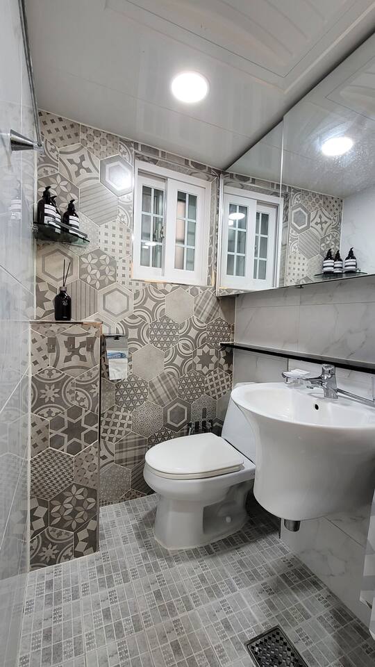 욕실: 세면대, 샤워대, 변기, 세탁기