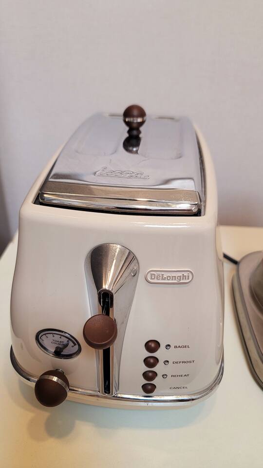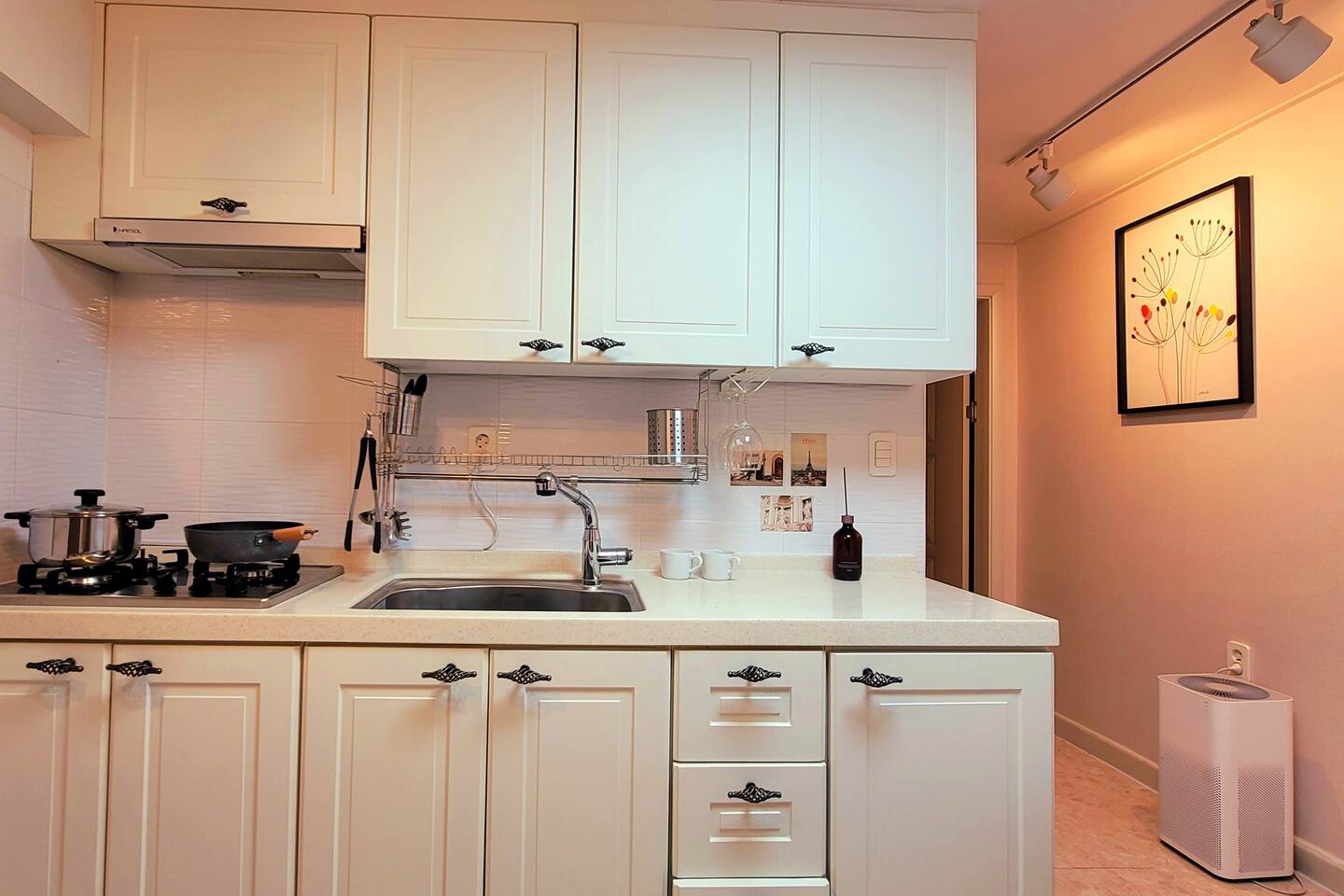 거실겸주방: 식탁, 냉장고, 공기청정기, 가스렌지, 싱크대, 전자렌지, 토스트기, 커피포트, 그릇, 접시, 컵 등 식기류