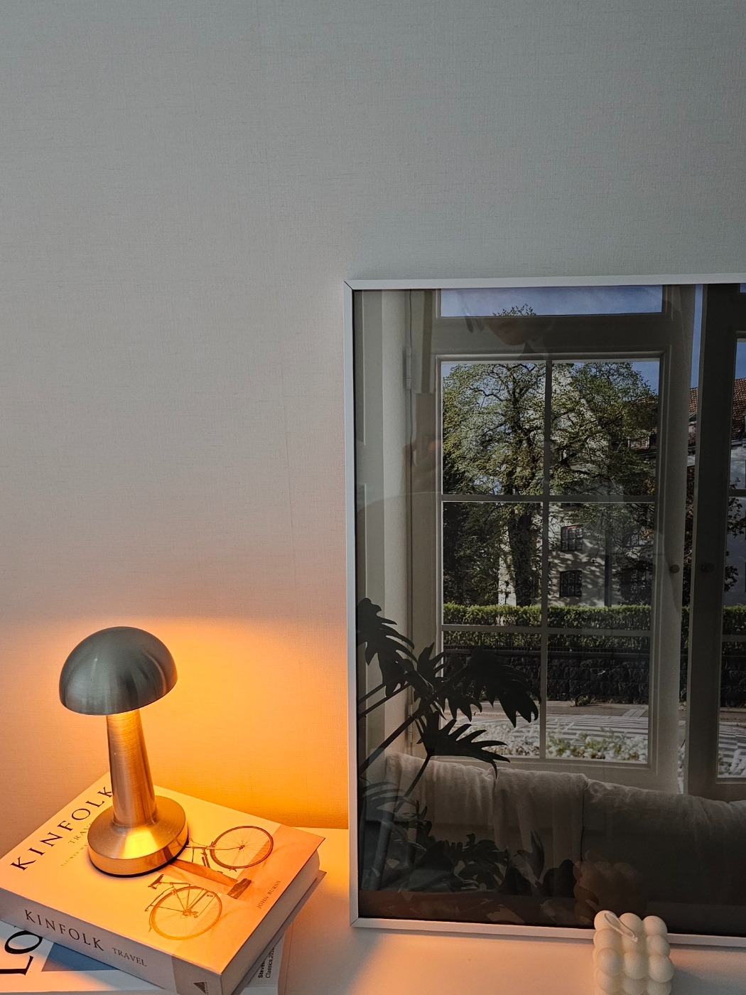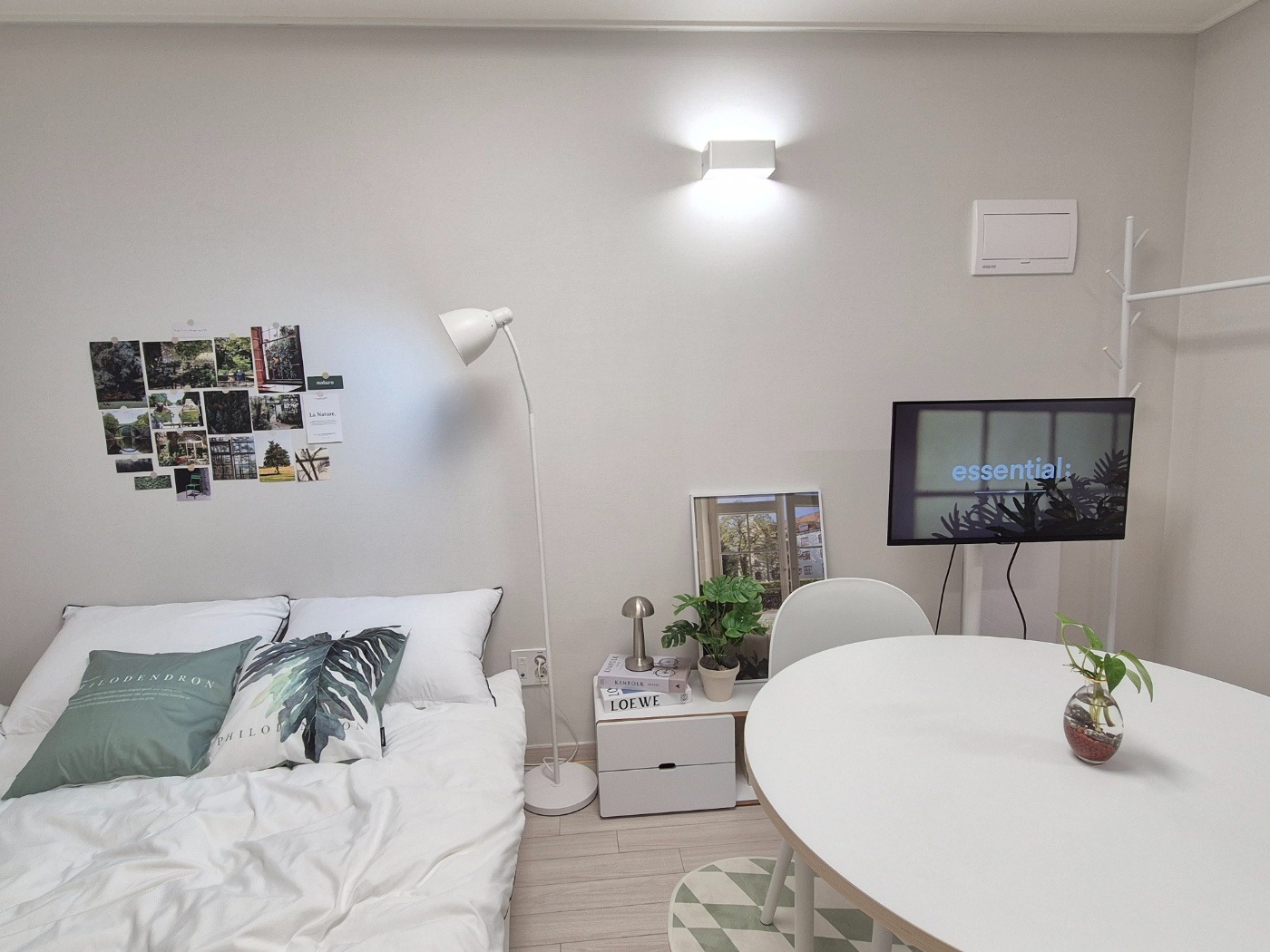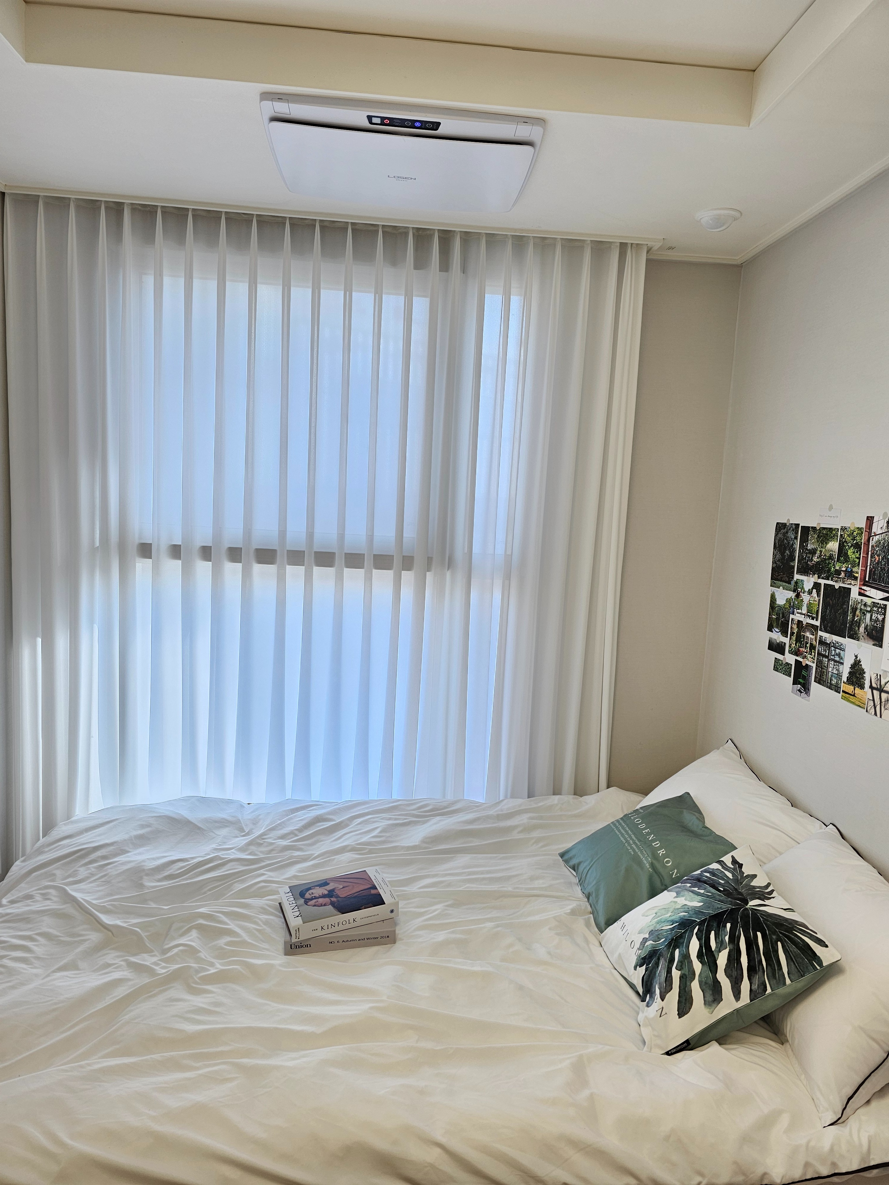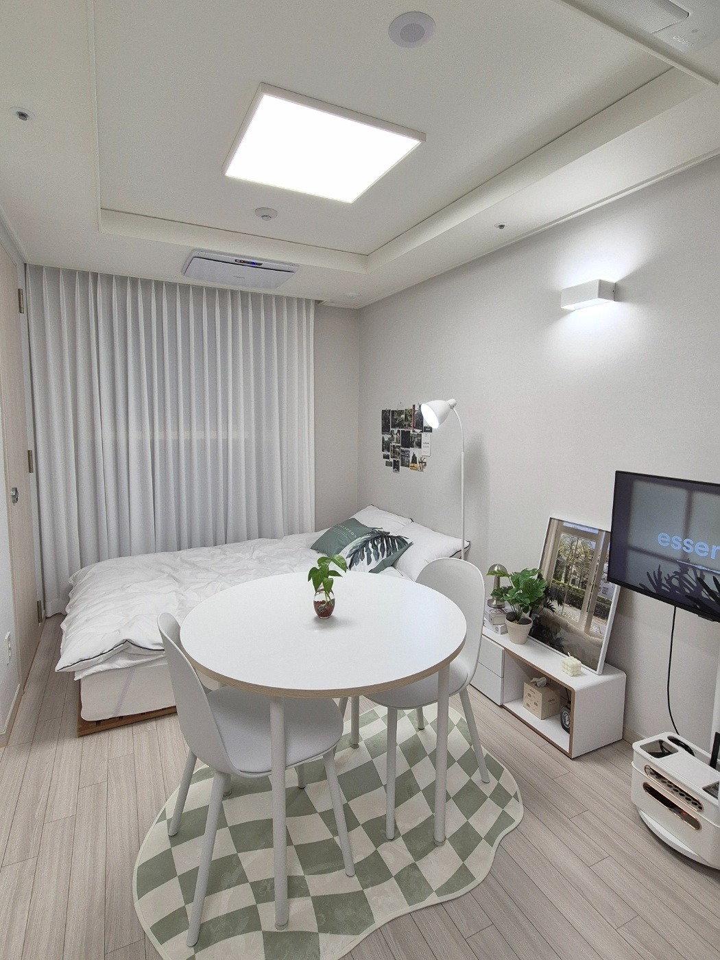- Clean and comfortable interior with white and green tones.