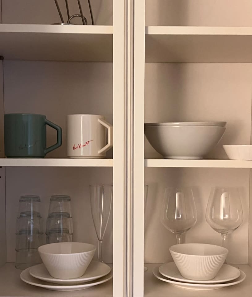 - 冷蔵庫、電磁調理器、ガスコンロ、鍋、調理器具、トースター、ティーケトル。