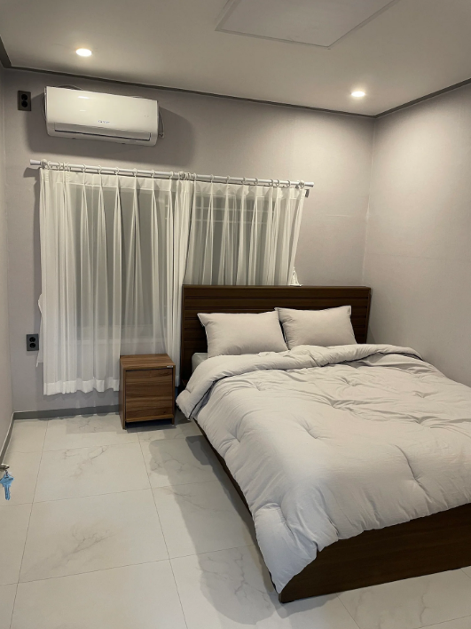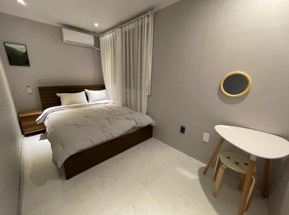 1층 침실2 (2인실) _ 퀸배드 1개, 협탁, 화장대, 거울, 옷걸이, 에어컨