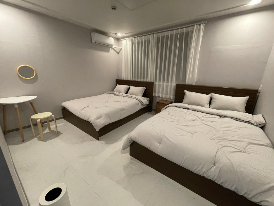 2층 침실4 (4인실) _ 퀸배드 2개, 협탁, 화장대, 거울, 옷걸이, 에어컨