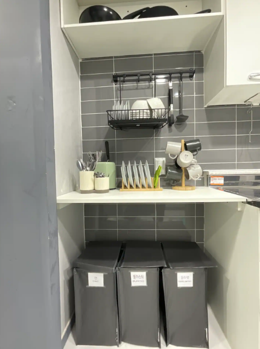 대형 냉장고, 가스레인지, 토스트기, 전기포트, 각종 요리도구 및 그릇,냄비,수저