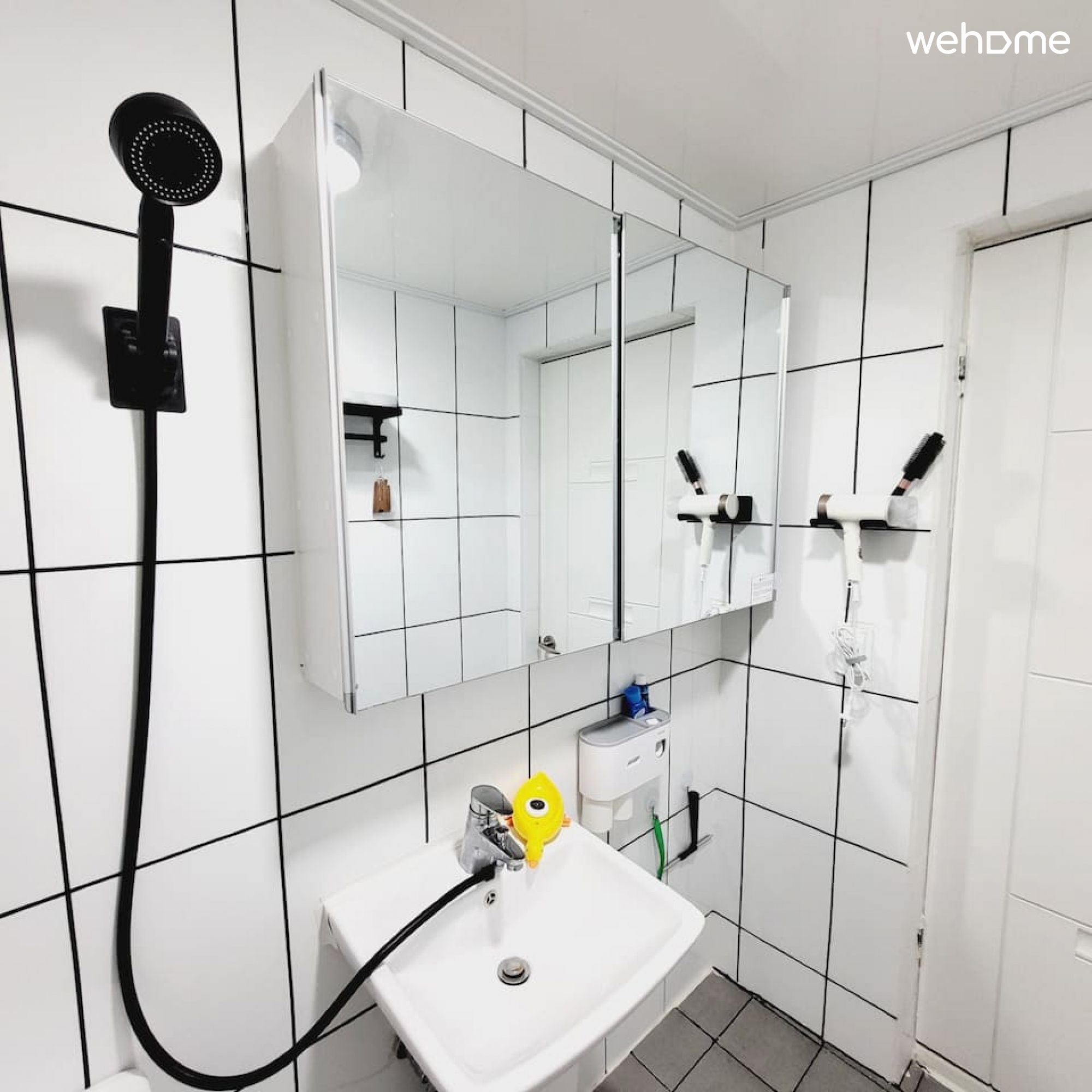 화장실: 샴푸, 컨디셔너, 바디워시, 치약, 핸드솝, 수건, 헤어드라이어 (칫솔 x)