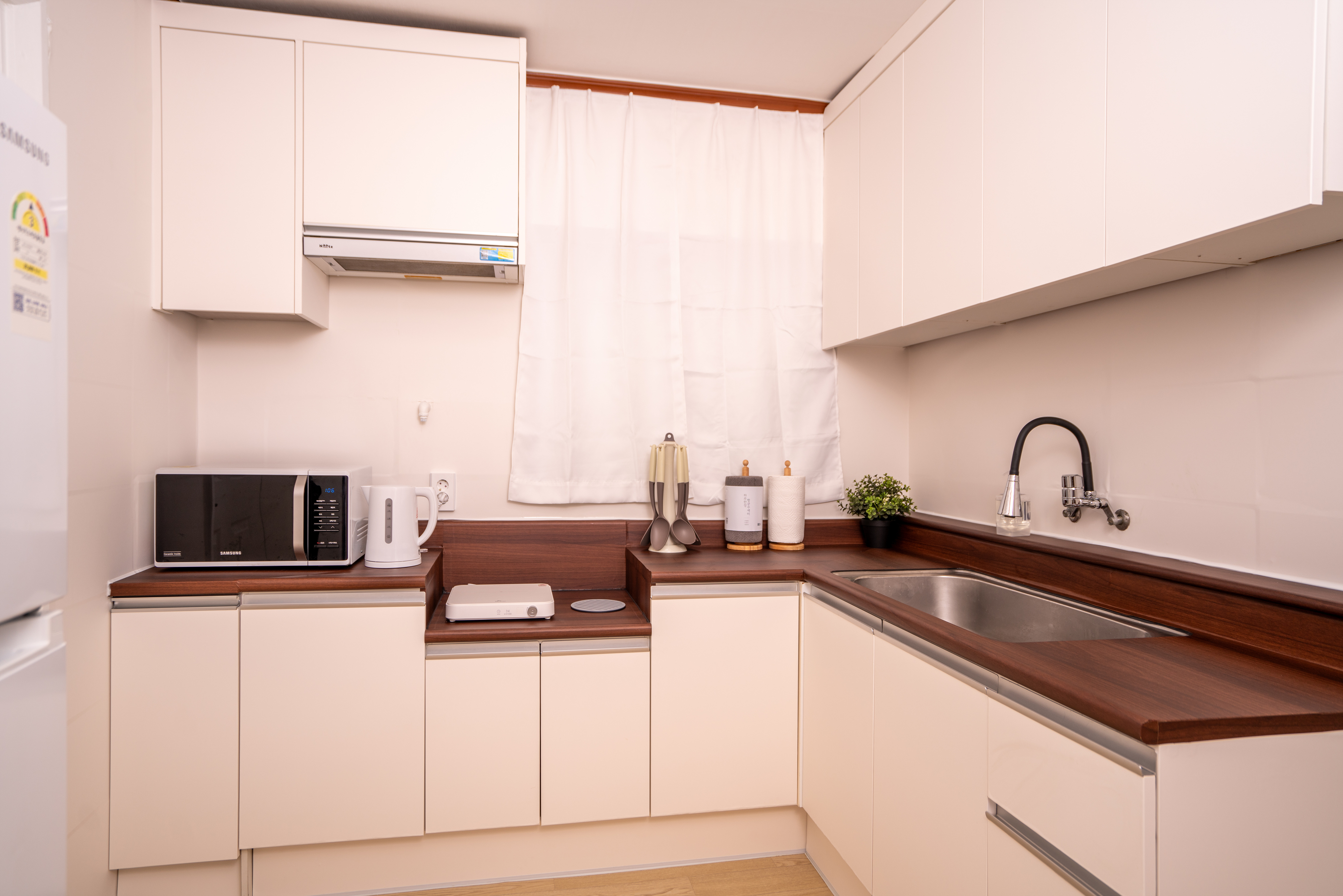 - 주방: 싱크대, 냉장고, 전자레인지, 인덕션, 전기포트, 각종 조리도구·식기류