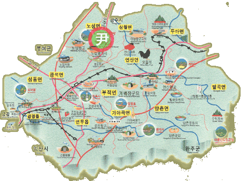 Hindrance ortho, Baekje Military Museum, EunjinNakseo Maitreya, Donam vow, gaetaesa, tapjeongho tourist area and experience to the program, such as the tea ceremony experience, cheonyeom dyeing, traditional knot, the traditional wrapping cloth, traditional music performances. Location Kyochon Hebrews Nonsan noseongmyeon 306 Tel 041-735-1215.