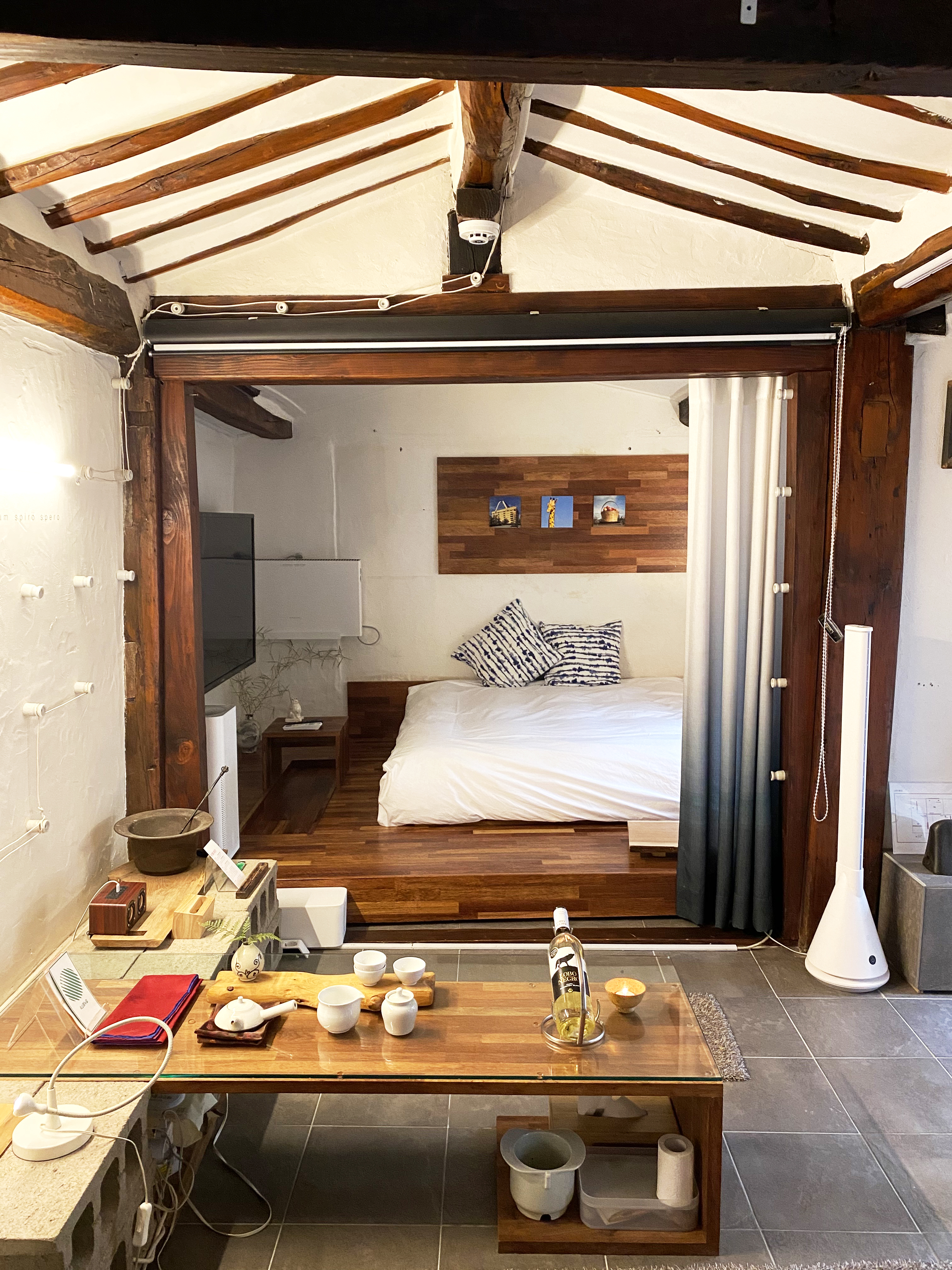 Although I was clumsy, I worked on this old and worn-out space myself. So, it is full of clumsy things, has a lot of stains on it, and has some inconveniences in using it. Please consider this as a lot of affection, and ask for your generous understanding in advance. - Viva la vida [Long live life] is located in a small alley in a quiet residential area. Since it is a private space, please feel free to use it, but we would be very grateful if you could follow a little etiquette with your neighbors regarding noise. - We are cleaning diligently to ensure a neat and tidy space. However, there are parts that appear sloppy due to poor work skills so far. We will continue to improve our skills by further honing them in the future. - As it is an old building made of wood, there is a high risk of fire. Please refrain from using indoor fire. A lighter is provided indoors to light incense, but please refrain from using it for any other purpose. - When you open the wooden gate, there is a glass door right away. The inside of the glass door is a space where everyone takes off their shoes and lives. - There are indoor slippers in the shoe rack next to the front door. We would appreciate it if you could use them. Please use indoor slippers even in the yard. - Please do not step on the yard!! Plants in the yard are also living things. Please treat me with affection. - A tea ceremony set and green tea by artist Jinwan Kim are prepared in the center of the living room. Please enjoy the tea ceremony in your own way. In addition, in one corner of the kitchen, coffee and drippers are prepared for hand-dipping, and a tea set is available for enjoying afternoon tea. Please enjoy your morning coffee and afternoon tea leisurely on the floor. ^^ - Damage to products (ex. wine glasses, tea cups) occurs frequently. Please be aware that repayment can be made at the minimum price, and please use it with care. - We carry out detailed inspections for damage to internal devices and products every day. If damage is suspected or occurs, please be sure to contact us. - Although the artists' works are small, they are displayed throughout the interior. I hope you have a day filled with emotions with the works. Damage to the work may result in large damages, so please be sure to view it with your own eyes only. - Viva La Vida is structured with a master bedroom and shower room across a yard, but it was a big concern that the yard and garden could not be made completely indoors due to building code restrictions. Even though it is not completely blocked, we made the room cool and warm enough and made it possible to use the shower room without discomfort. We added a floor and a roof and windows to the roof to block the inflow of outside air and maintain warmth to improve convenience. However, the fact that it cannot be completely prevented is still a very big concern and challenge. ** Summer: When the yard is hot, turn on the air conditioner in the living room and blow cold air into the yard through the fan for about 15 minutes to quickly cool down. Also, if you do not use the mosquito net door, many mosquitoes will enter the room, so be sure to close the mosquito net door before use. ** A stove is provided during the winter. Please refrain from using it at excessively high temperatures as much as possible. (There is a high risk of fire due to overheating.) We hope that guests will use it carefully. - Because there are so many lights and switches, it is very difficult to find them. A switch location diagram is provided separately under the TV. The indirect lighting under the floor turns off when you turn off the power strip switch to which the iPad is connected. Hope you have a restful night. - I'm not an expert, so it's a small old house that has many shortcomings and can be cumbersome to use, but I carefully prepared each and every detail. We hope you have a comfortable and happy time. If you feel uncomfortable or have any questions, please do not delay and contact us.