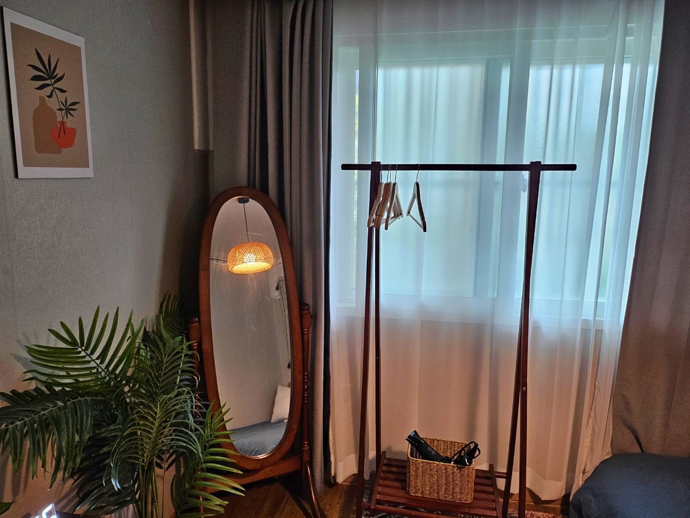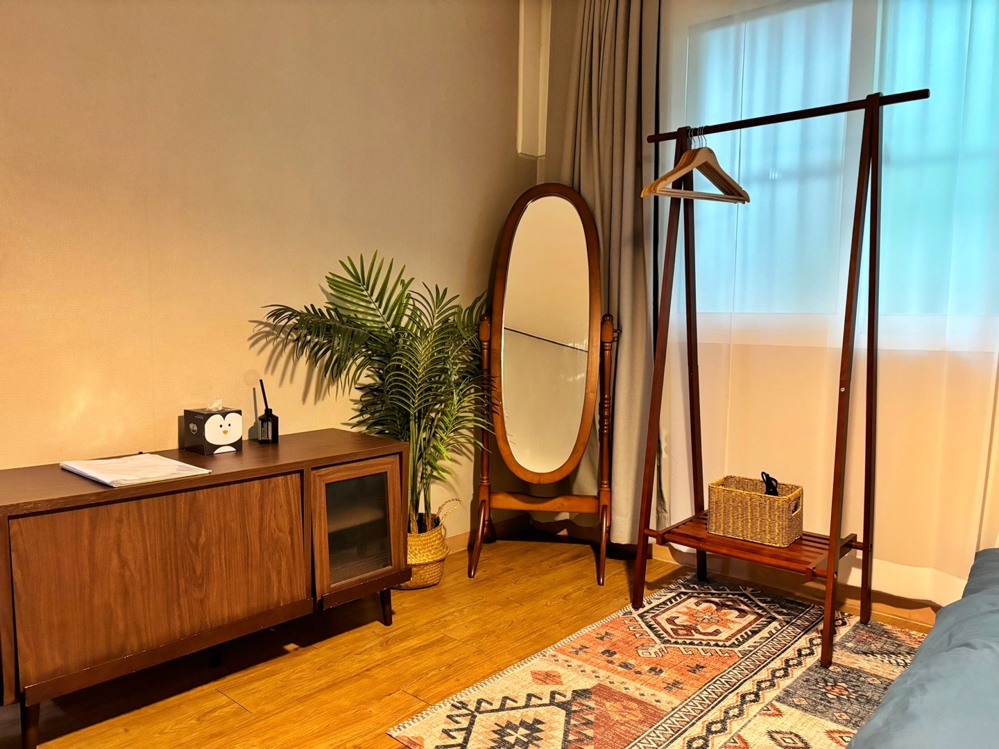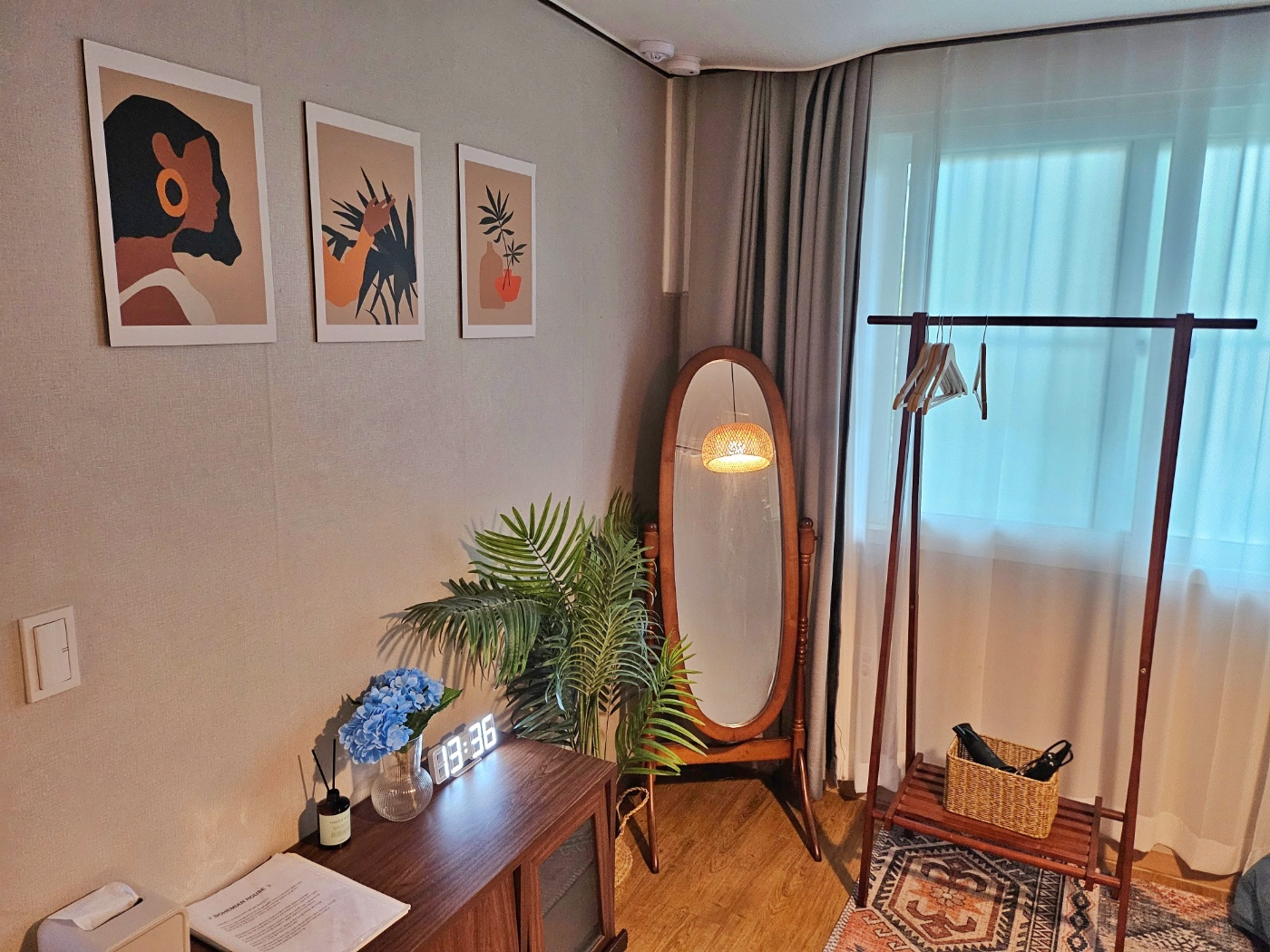 화장대, 전신거울과 행거가 준비되어 있습니다. 아침에 큰 창을 열면 큰 나무들과 트여있는 하늘이 창문으로 보이는 좋은 뷰를 즐기실 수 있습니다.