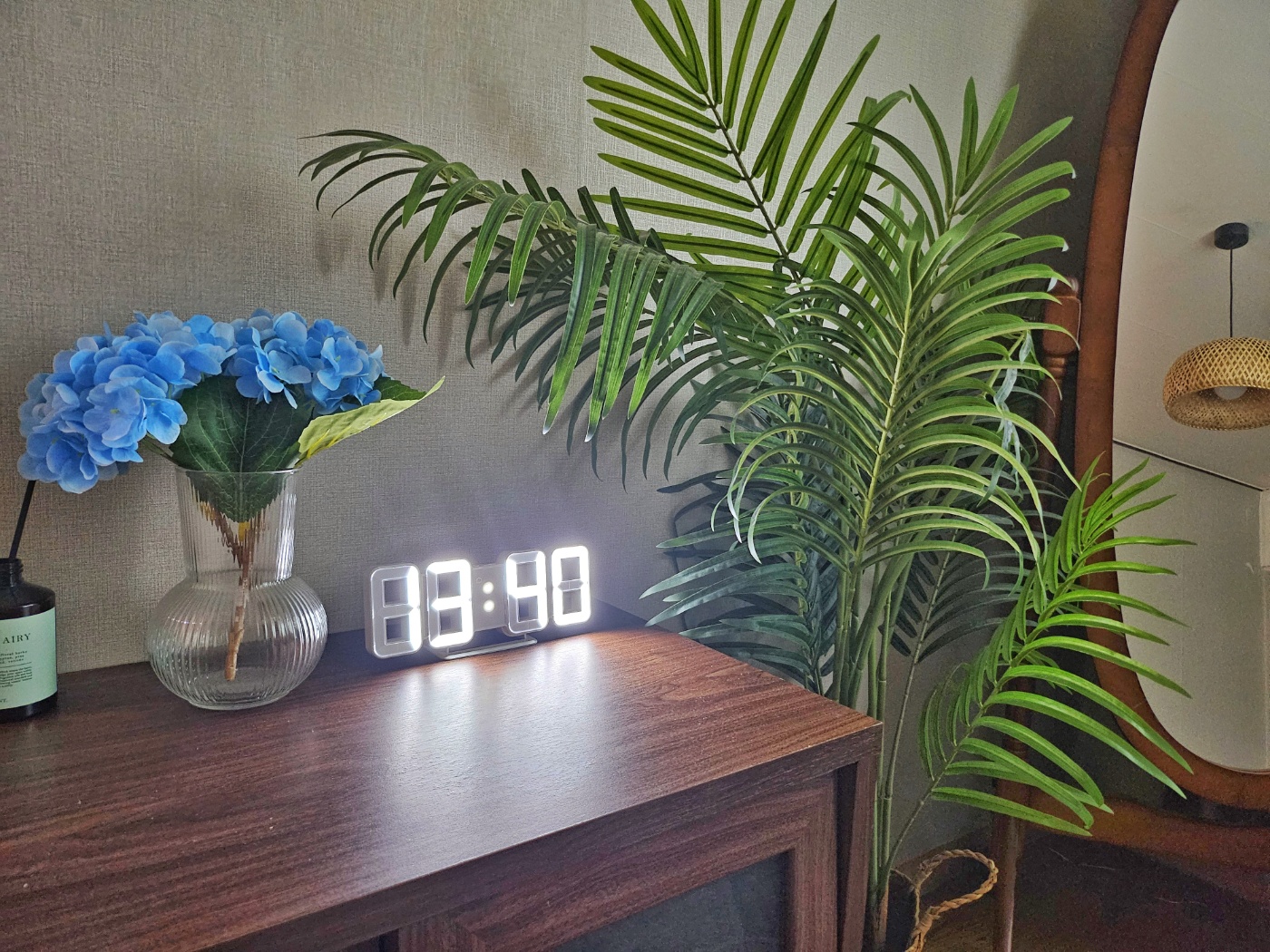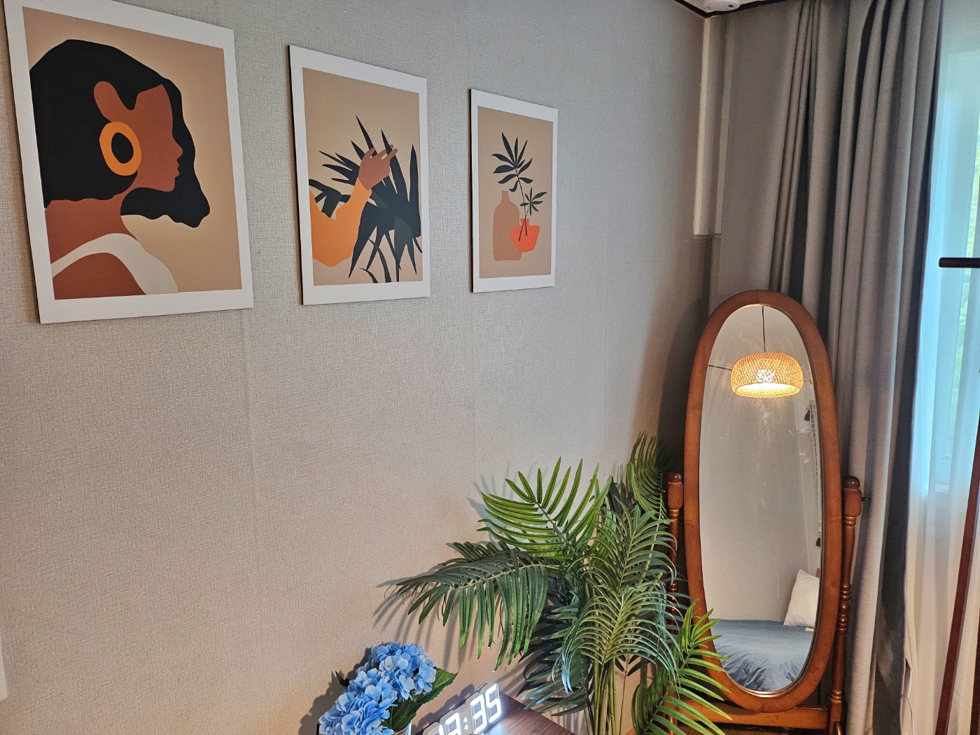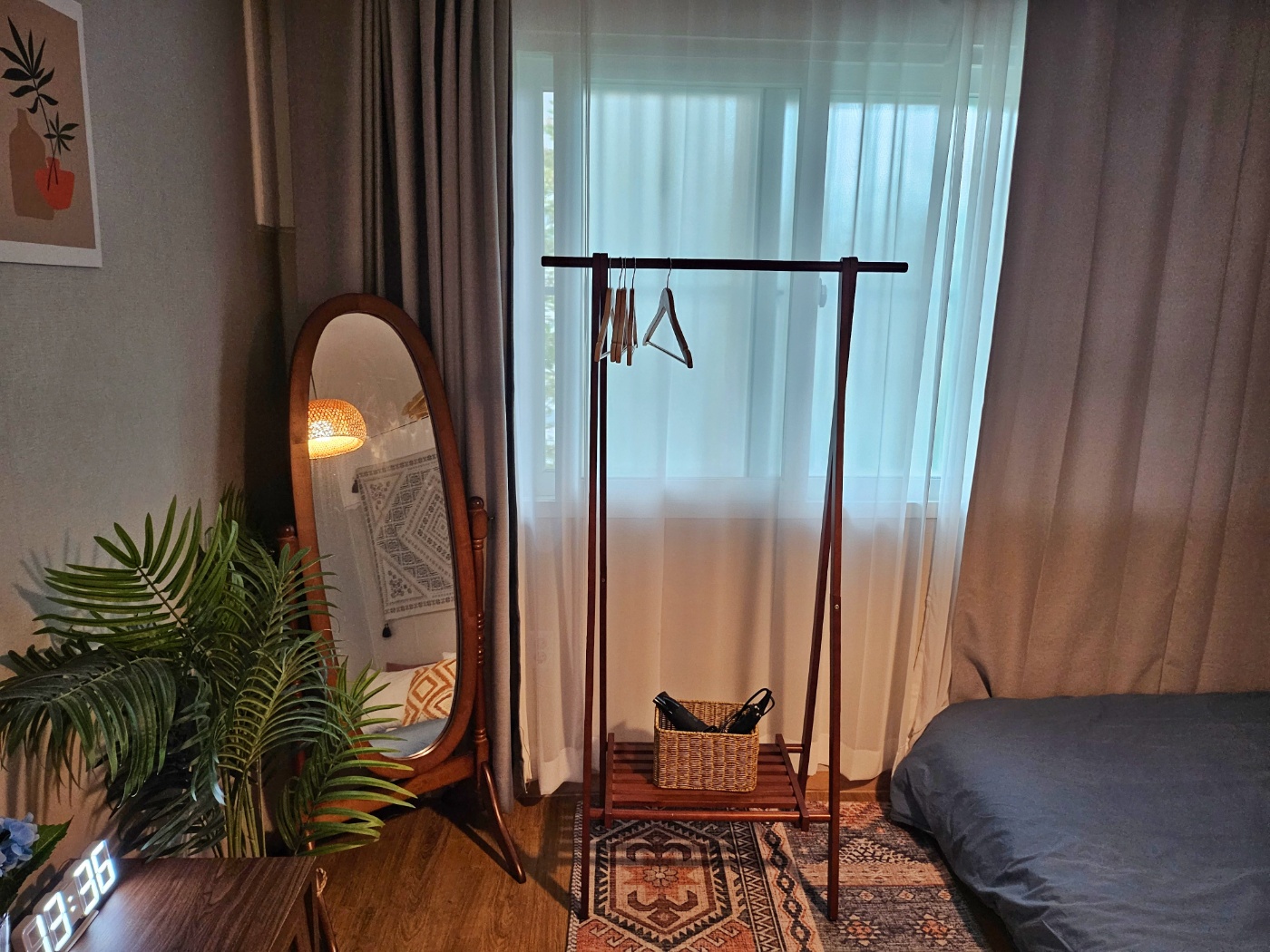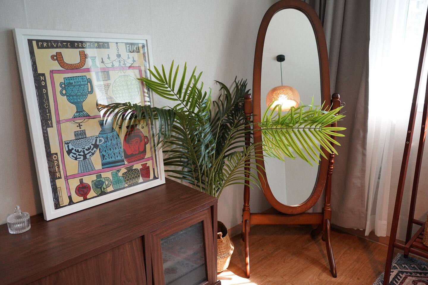 화장대, 전신거울과 행거가 준비되어 있습니다. 아침에 큰 창을 열면 큰 나무들과 트여있는 하늘이 창문으로 보이는 좋은 뷰를 즐기실 수 있습니다.