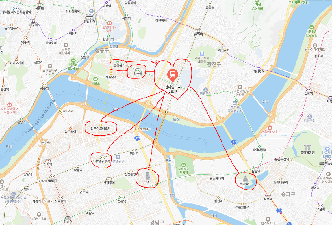 건대 입구 부근에 위치하여, 지하철 2호선 모두 이용 가능하여 교통이 편리합니다.