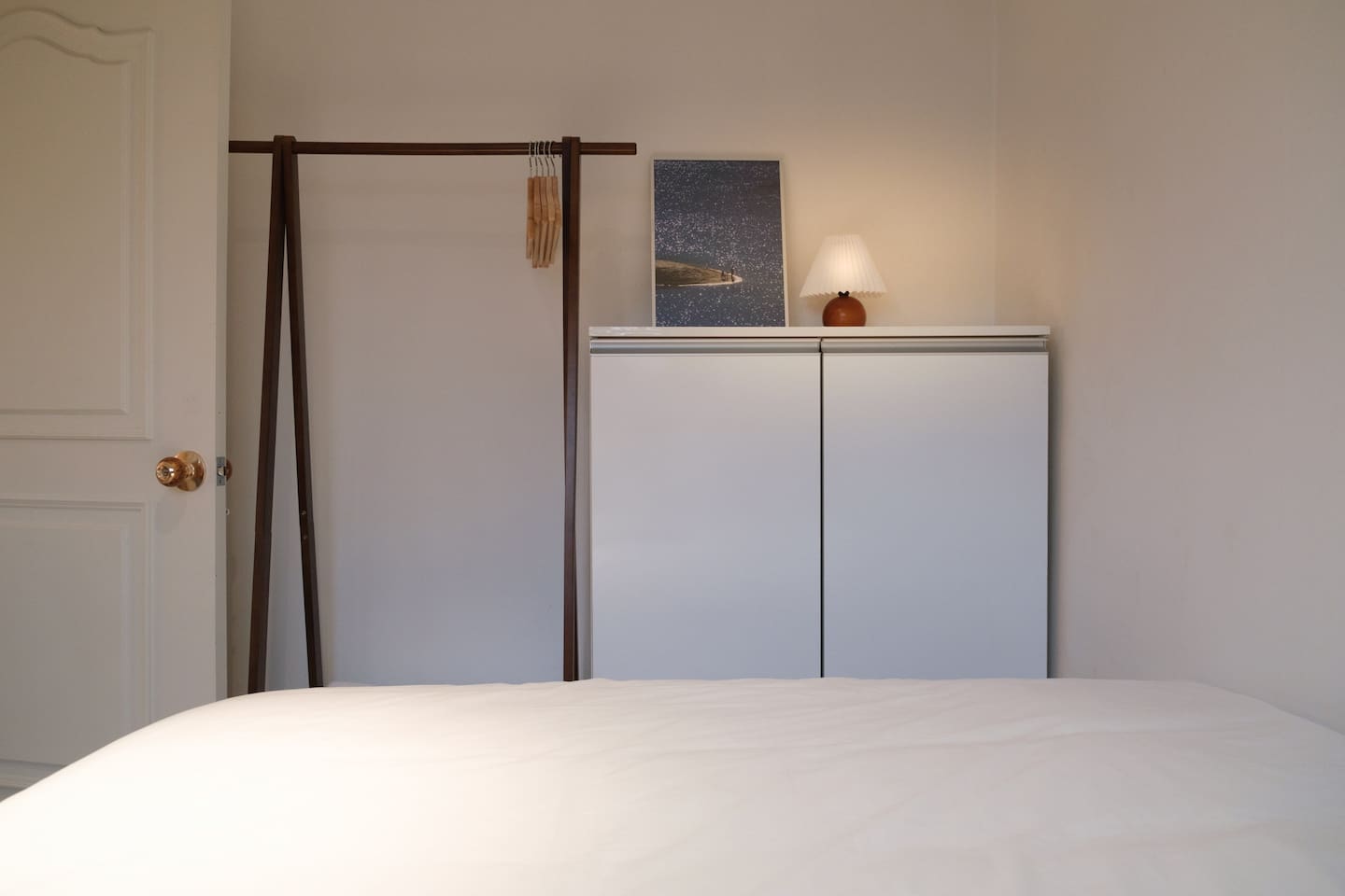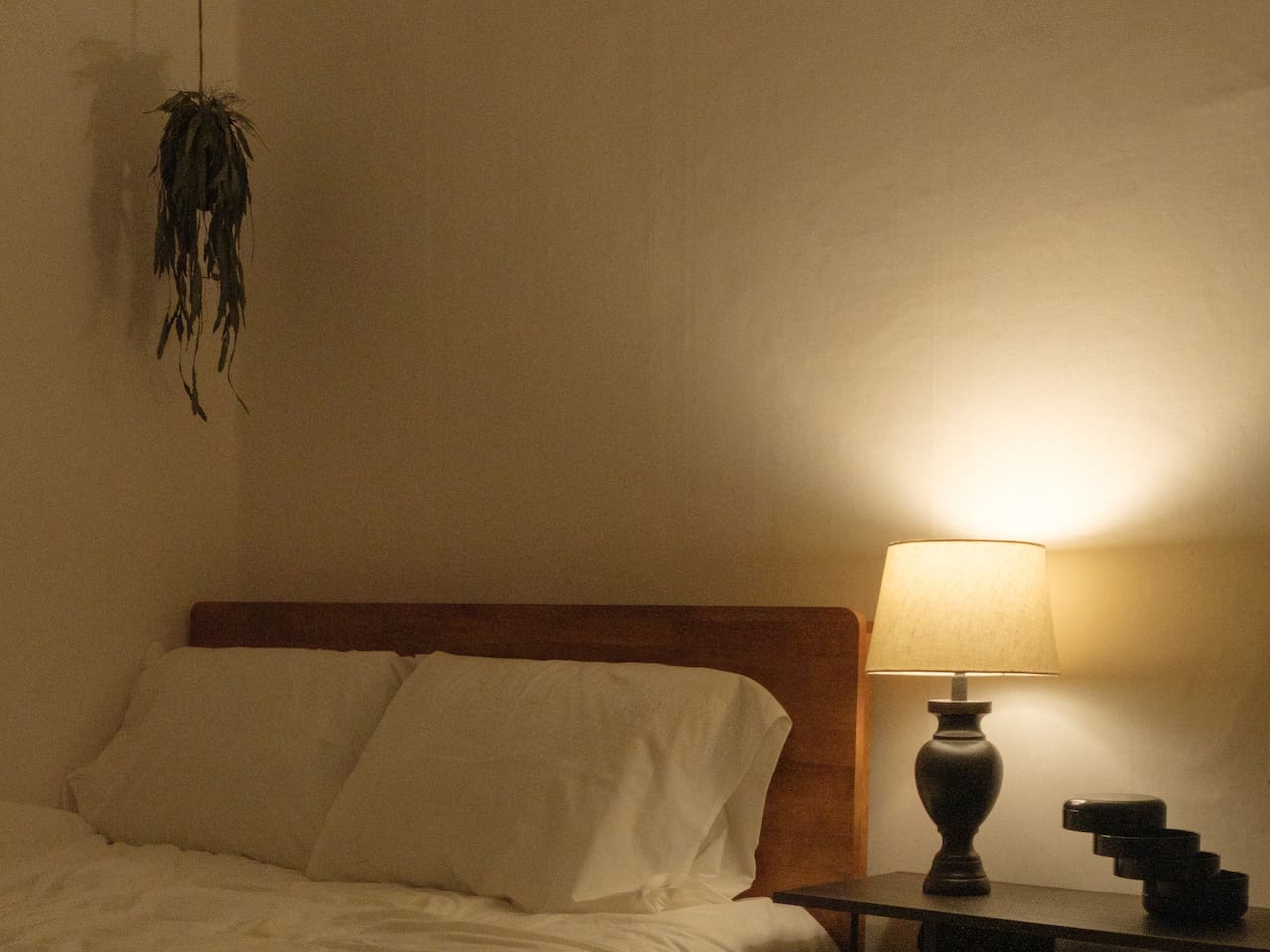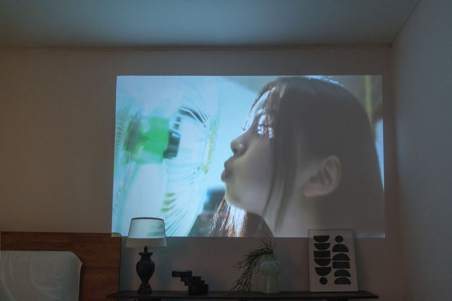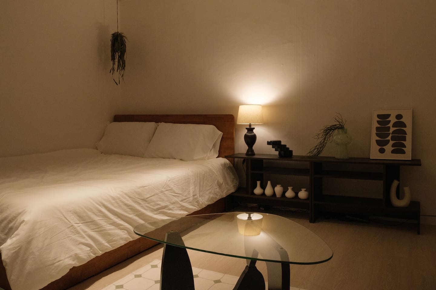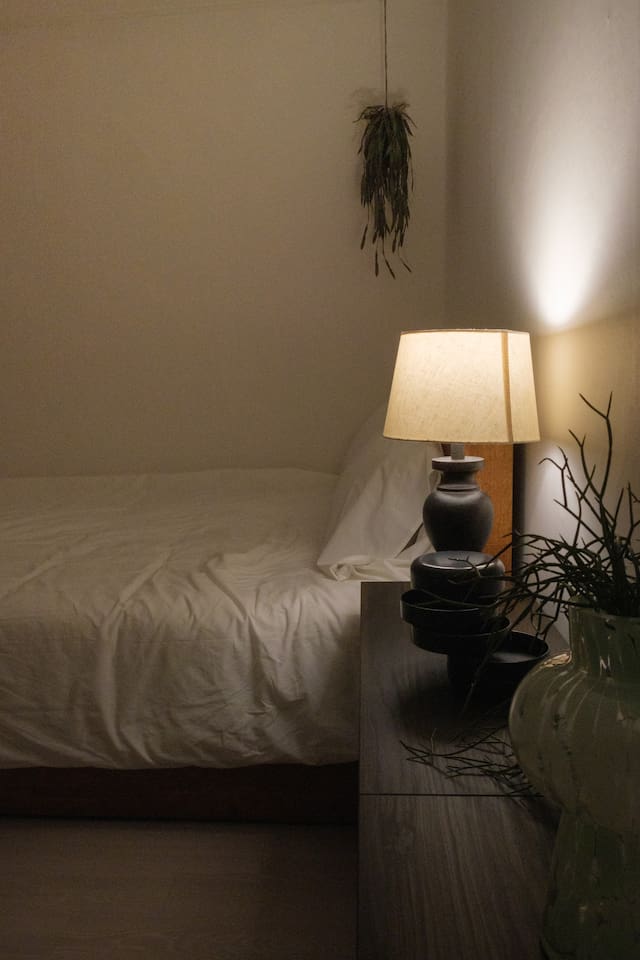 ❣️ Bedroom 1: Warm lighting with a queen bed, sofa bed, hotel-style bedding, bedside table, tea table, and a projector. Full-length mirror and Wi-Fi.
