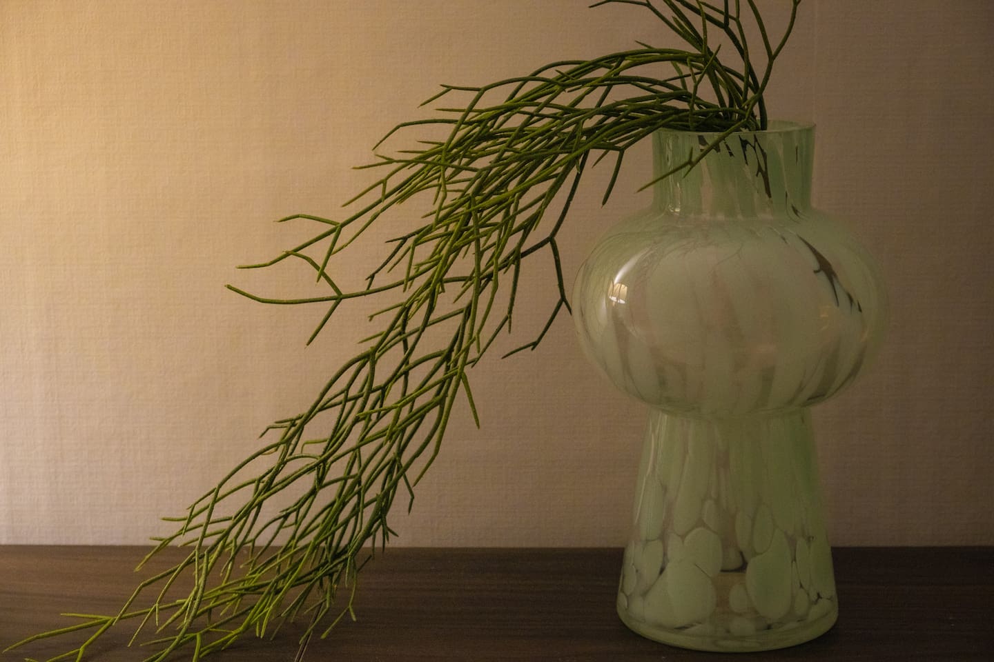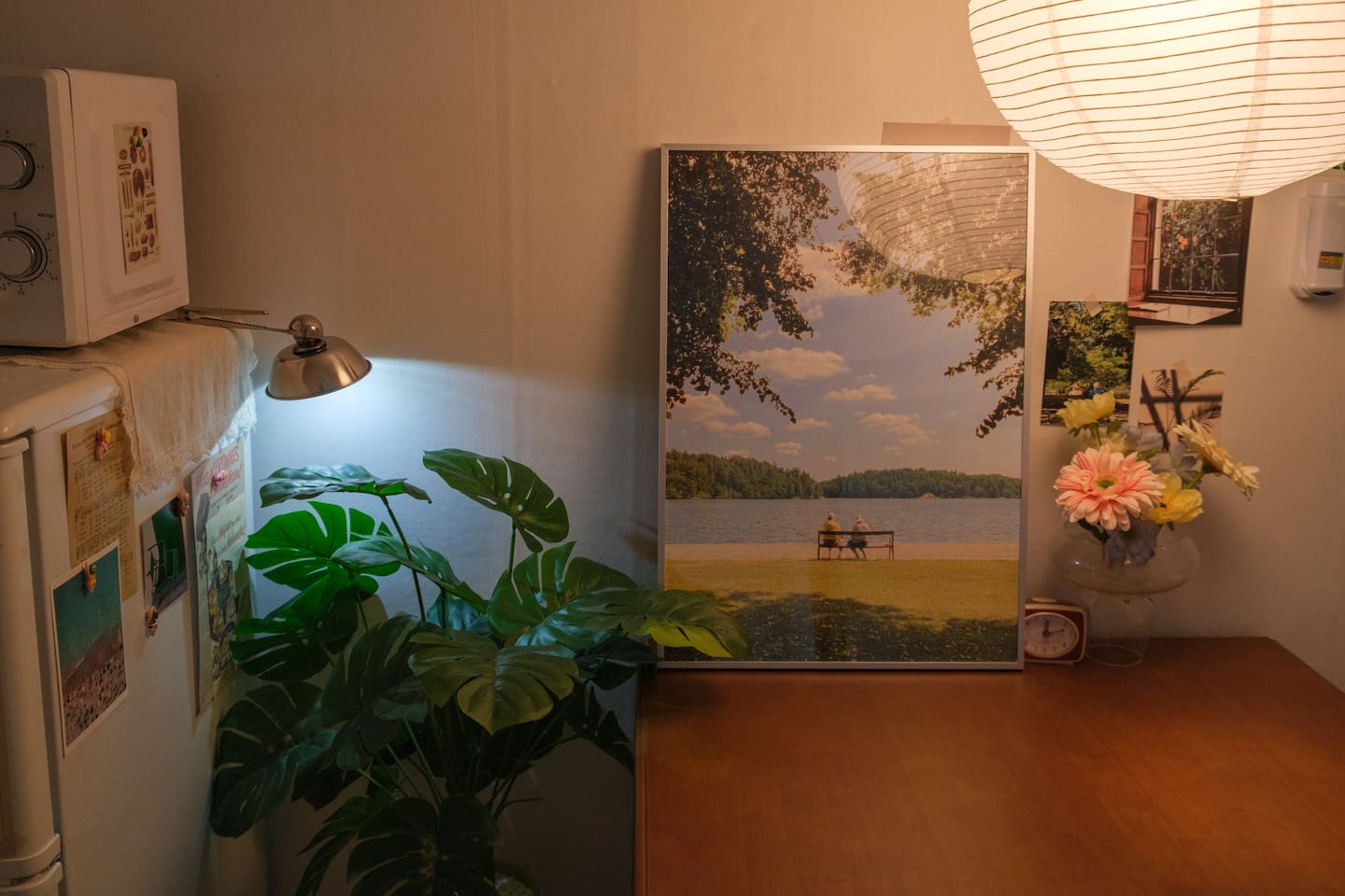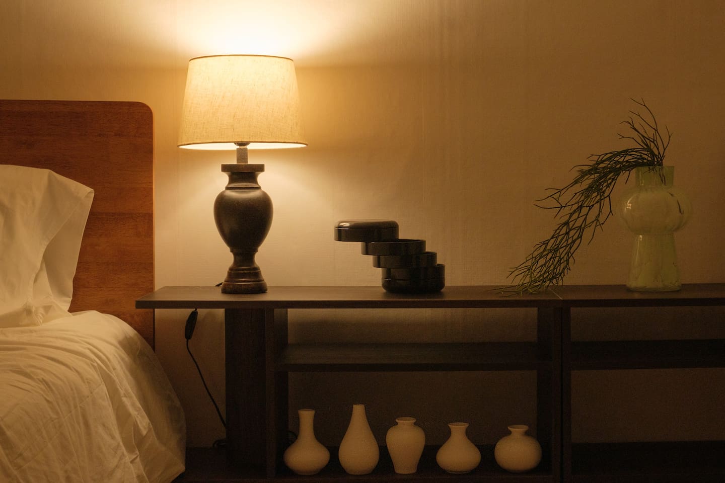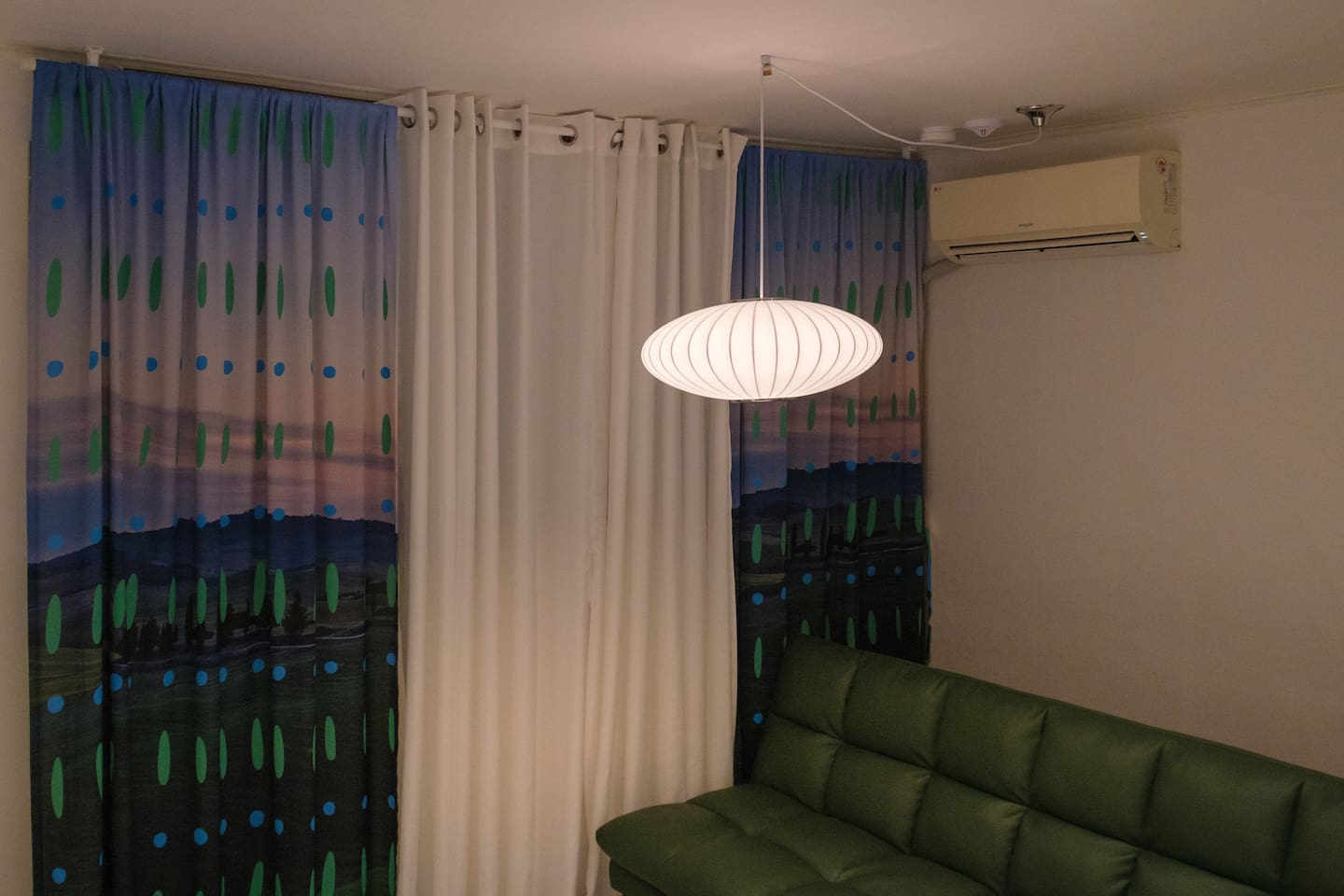 ❣️ Bedroom 1: Warm lighting with a queen bed, sofa bed, hotel-style bedding, bedside table, tea table, and a projector. Full-length mirror and Wi-Fi.