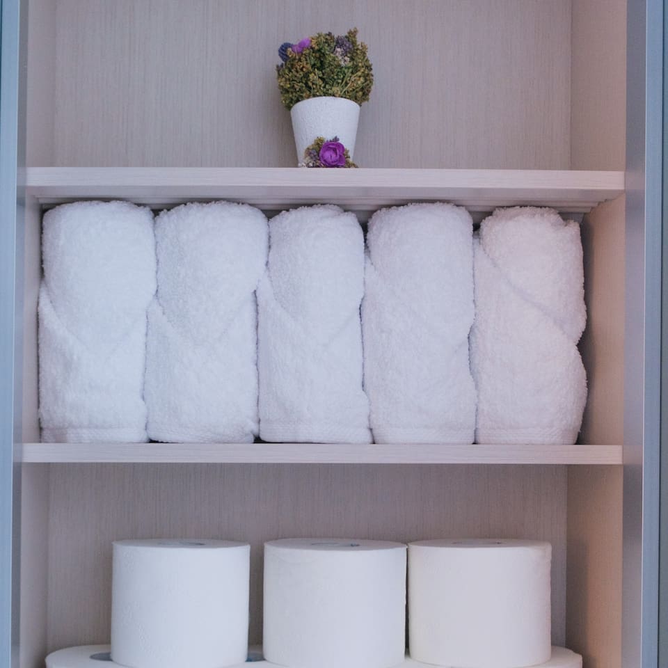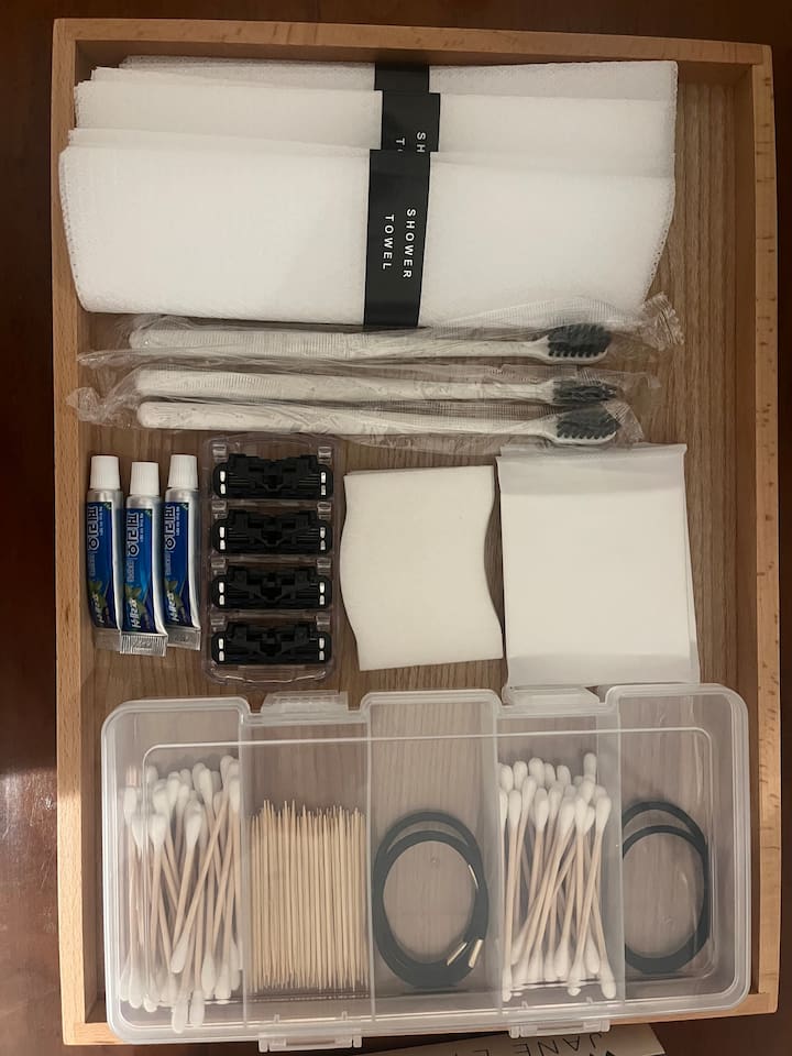 ❣️ Bathroom: Shampoo, conditioner, body cleanser, toothpaste & toothbrush set, body towel. Hand wash, facial cleanser, cotton pads, cotton swabs, hair ties.