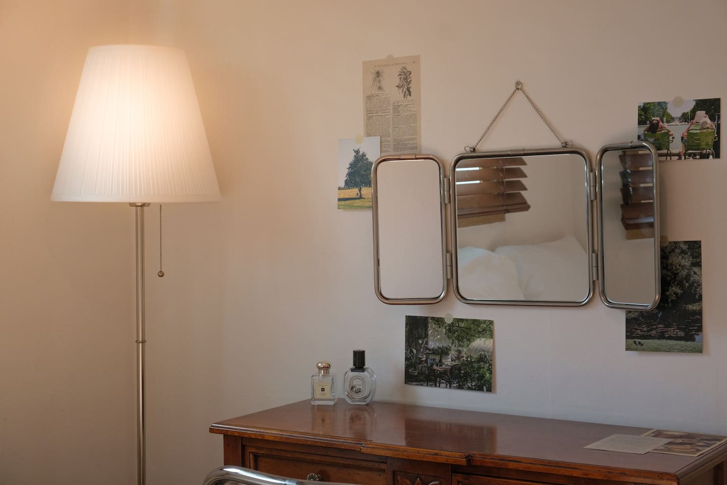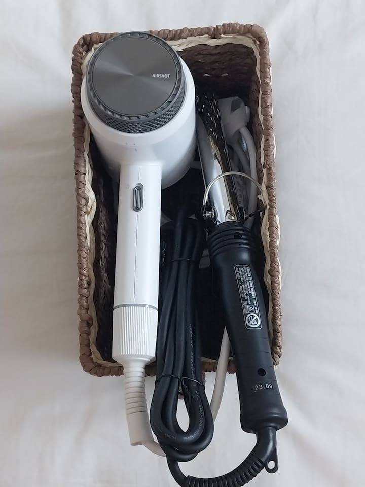 ❣️ Bedroom 2: Soft lighting with a queen bed, bedside table, vanity, mirror, clothes hanger, and a fan. Cordless vacuum, hair dryer, hair straightener, and brush.