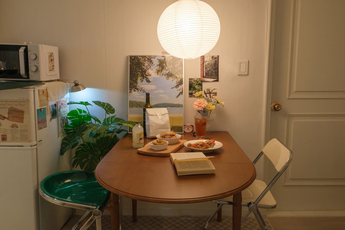 ❣️ Living Room and Kitchen: Dining table and chairs. Refrigerator, microwave, coffee maker, toaster, and gas stove.
