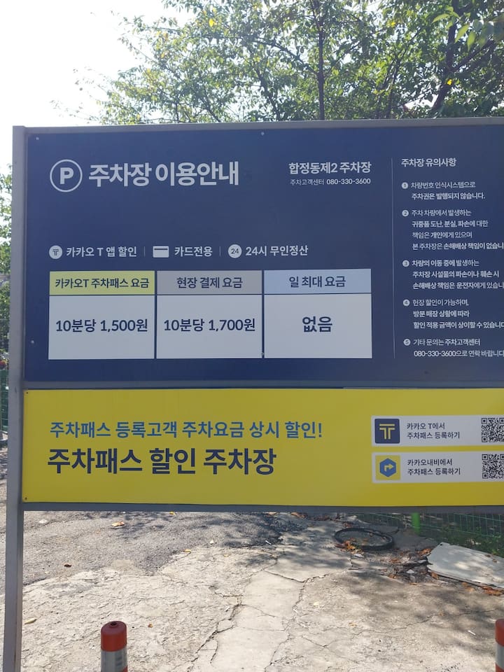❣️ Free parking for one car is available in front of the accommodation. However, parking is on a first-come, first-served basis. If no parking spot is available, please use the paid parking lot located 1 minute behind the accommodation (Hapjeong-dong No. 2 Parking Lot, 1,700 KRW per 10 minutes).