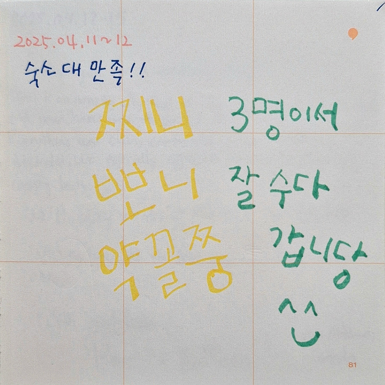 ์ง์ง ์น๊ตฌ๋ค๊ณผ ๋๊ธฐ ๋๋ฌด ์ข์ ์์์์ด์.