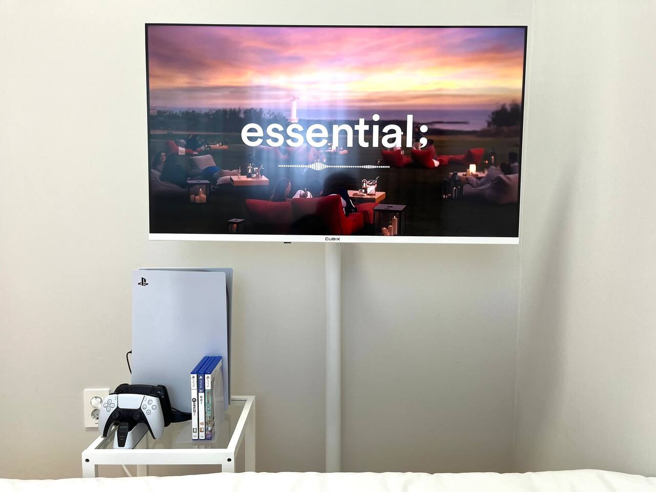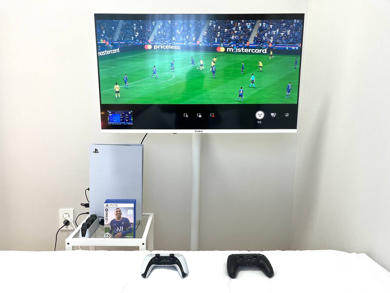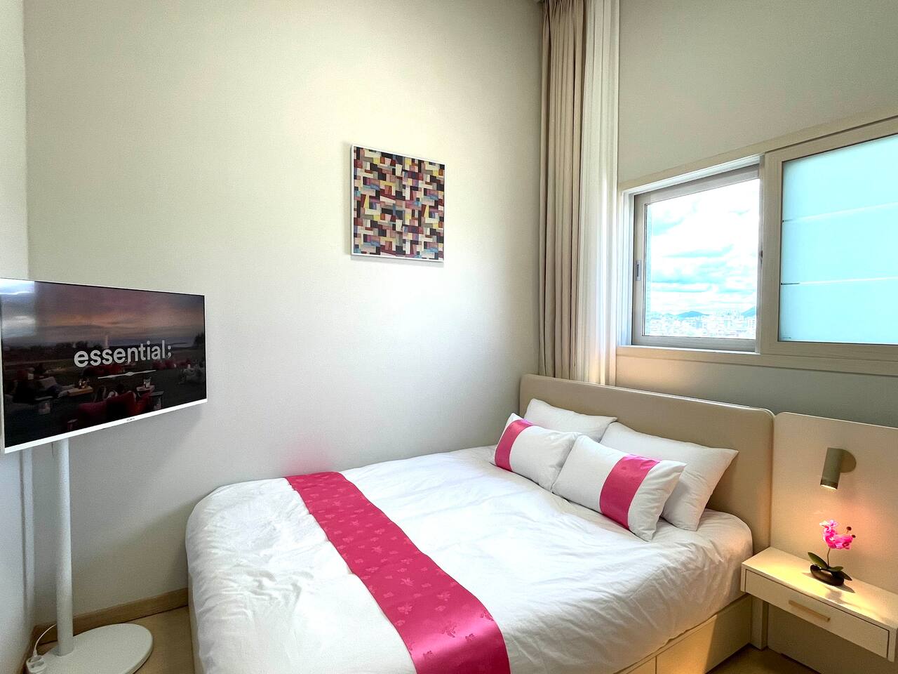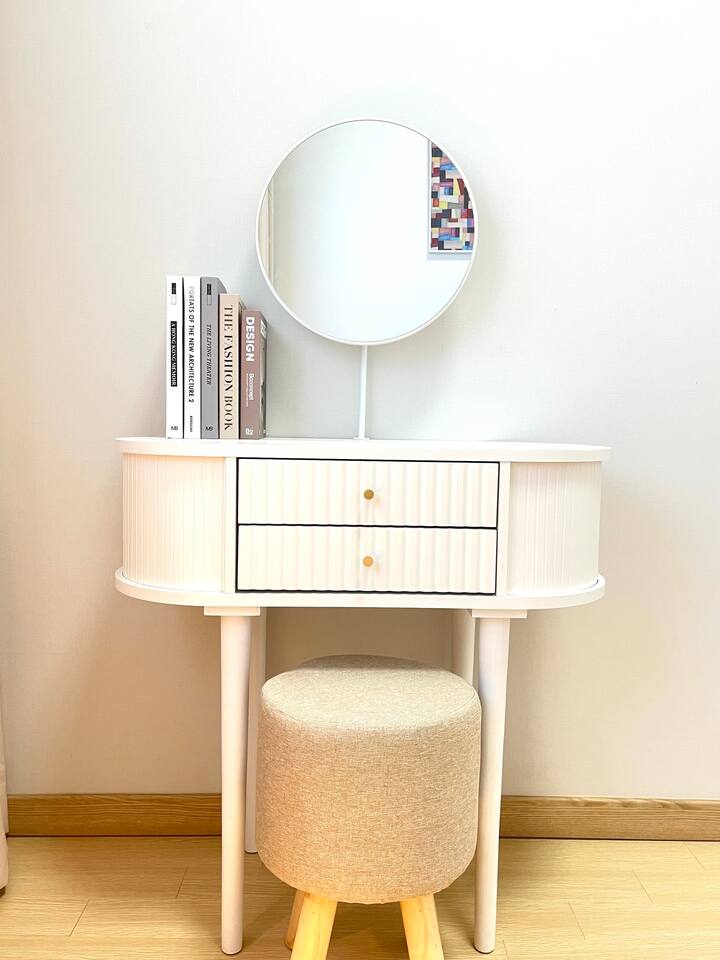 비품 : 퀸사이즈 침대 1개, 40인치 TV, 화장대 및 의자, 플레이스테이션(PS5), 각종 충전기, 스탠드,
