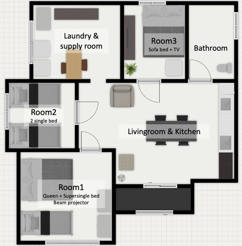 - 1 queen bed (150*200cm)