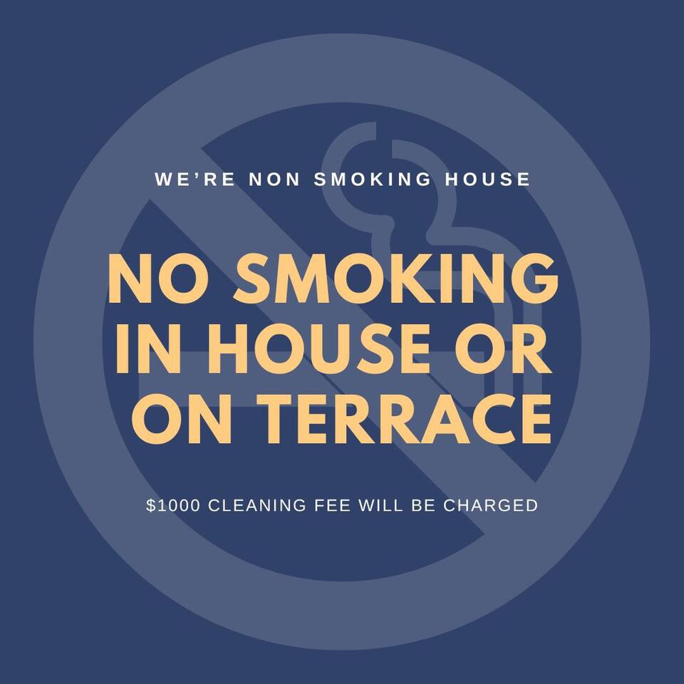 -ABSOLUTELY NO PARTY/NO LOUD MUSIC/ NO SHOES/ NO SMOKING (house and balcony/terrace)/ NO CANDLES/ NO PETS INSIDE or ON THE PROPERTY