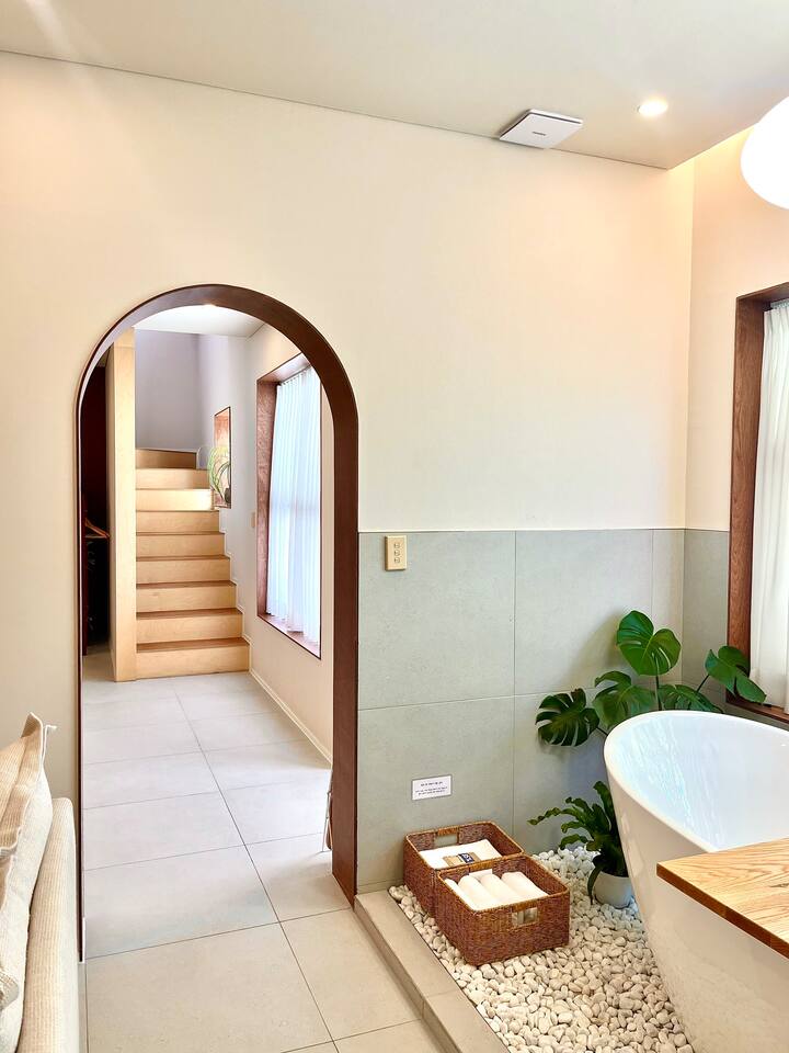 마당이 있는 2층 단독주택으로, 조용하고 아늑한 분위기 속에서 편안한 휴식을 즐기실 수 있는 곳입니다. 특히 옥상과 족욕탕에서는 바다와 주택가가 어우러진 아름다은 뷰를 감상하실 수 있으며, 일몰이 가장 이쁘게 보이는 숙소입니다.