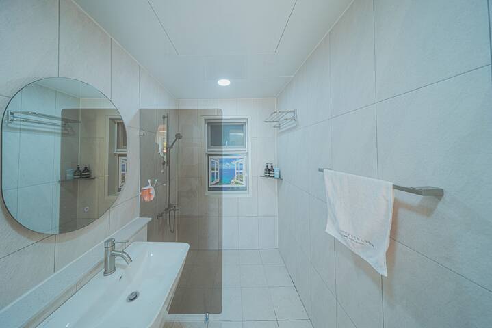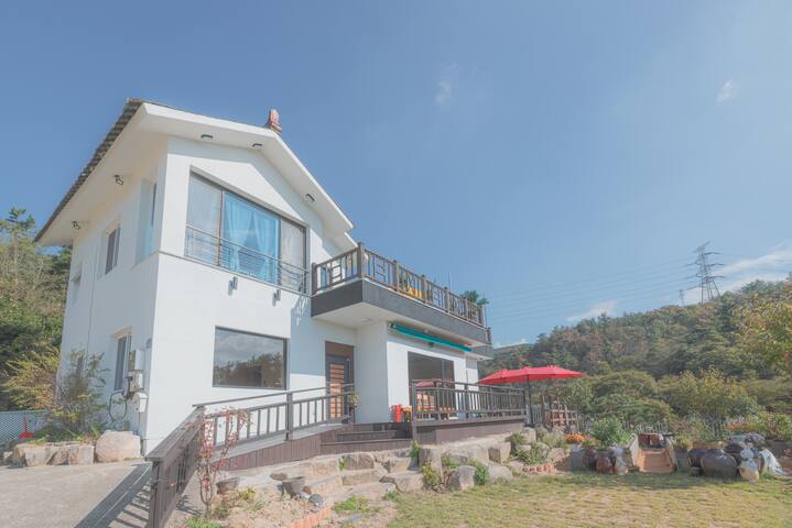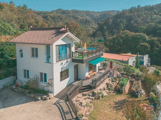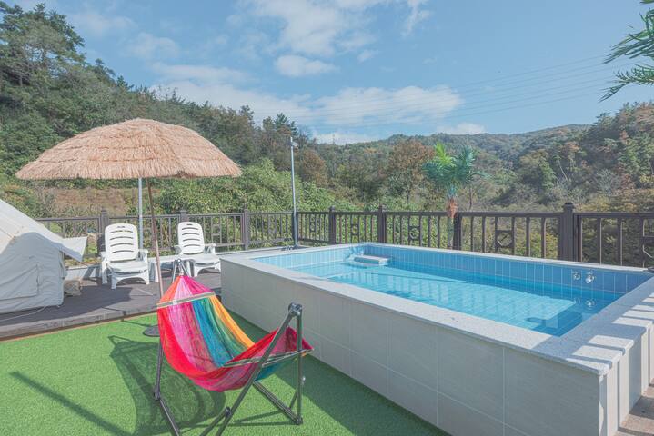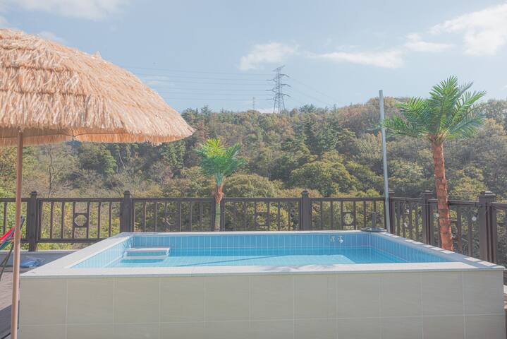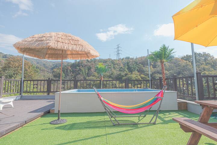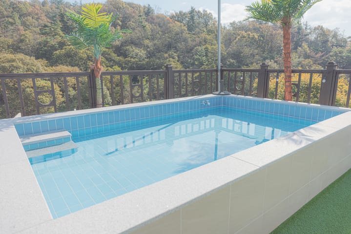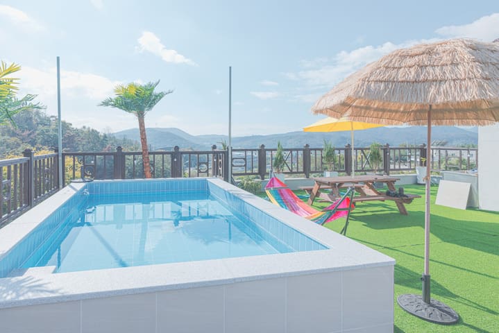 . 퀸사이즈 침대의 가족방과 욕실, 옥상야외 캠핑장이 있습니다. (뷰가 멋집니다) ## 수영장(동절기에는 운영하지 않음)