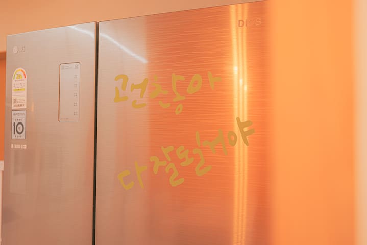 생수는 냉장고 안에 비치되어 있으며 부족시 이용할 수 있는 암웨이 정수기가 있어요.