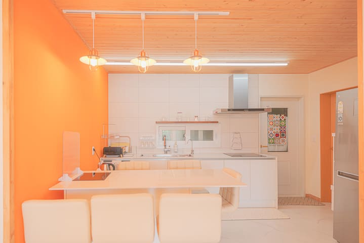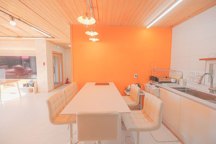 . 주방 : 최대10명까지 이용 가능한 식기, 수저, 냄비, 프라이펜, 컵 등 여러 가지 주방기 구와 간단한 요리를 할 수 있는 인덕션, 전자레인지가 있어요.