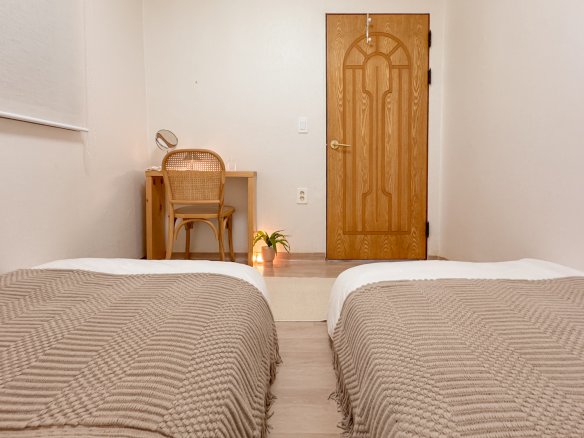 2 Single beds, dressing table, mirror, curling iron, hairdryer, charger, air conditioner