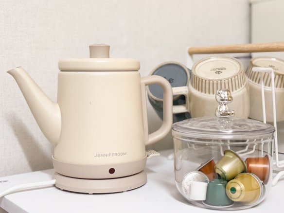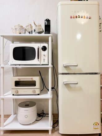 Induction cooktop, microwave, refrigerator, electric kettle, toaster oven, coffee machine