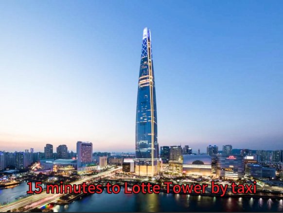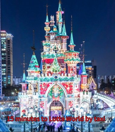 Lotte Tower, Lotte World, Seokchon Lake, Bangi-dong Food Alley – 15 min by public transport
