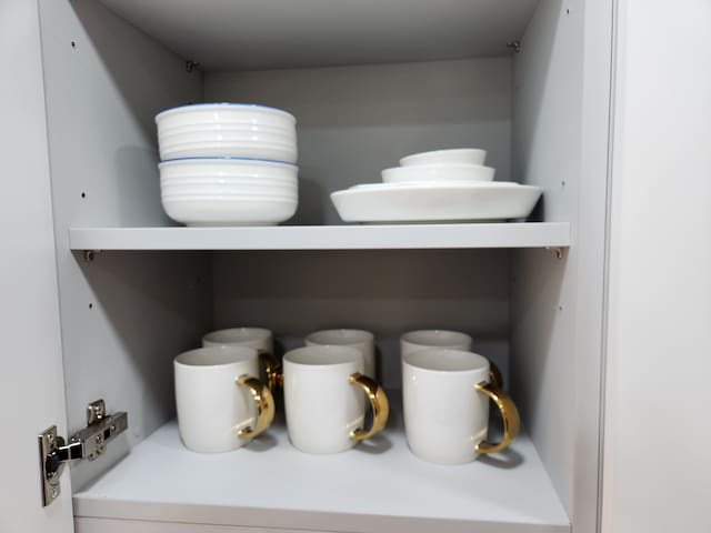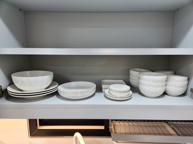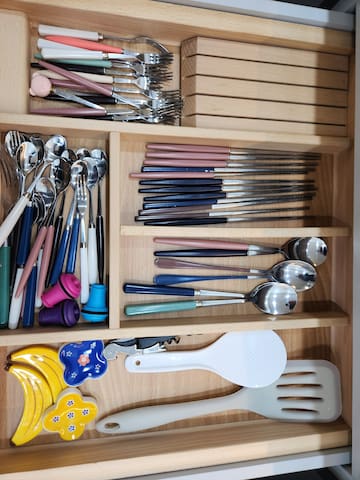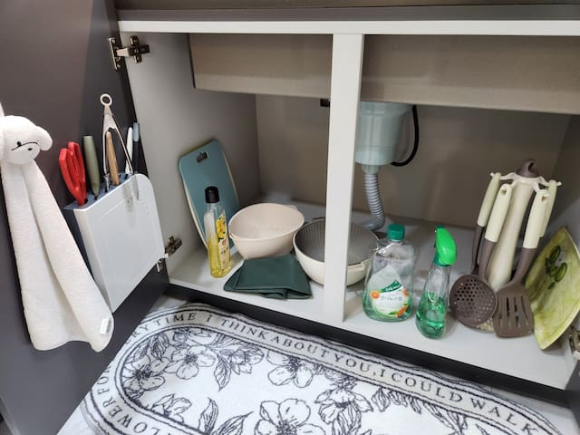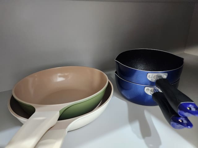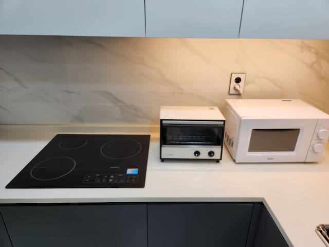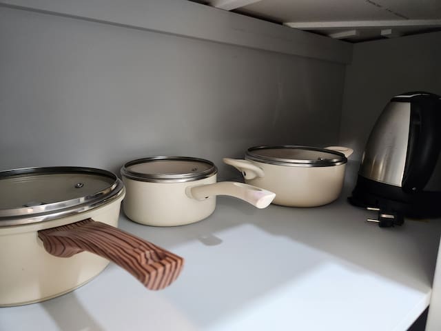 조리가 가능한 주방으로 전자레인지, 전기포트, 기본 조리도구와 식기류가 갖춰져 있습니다. 간단한 요리에 적합해요.