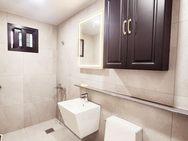 여유로운 욕실 2개로 단체 투숙 시에도 불편함 없이 이용 가능하며,
