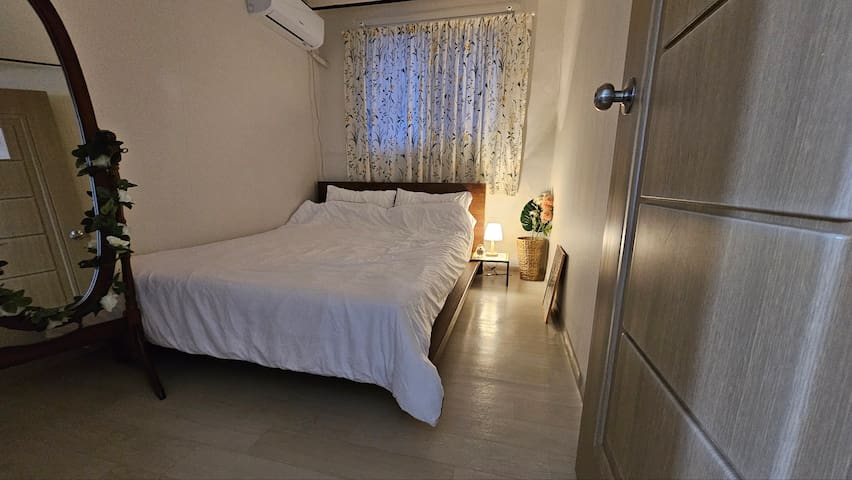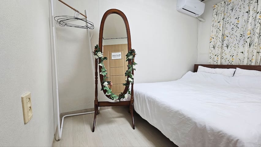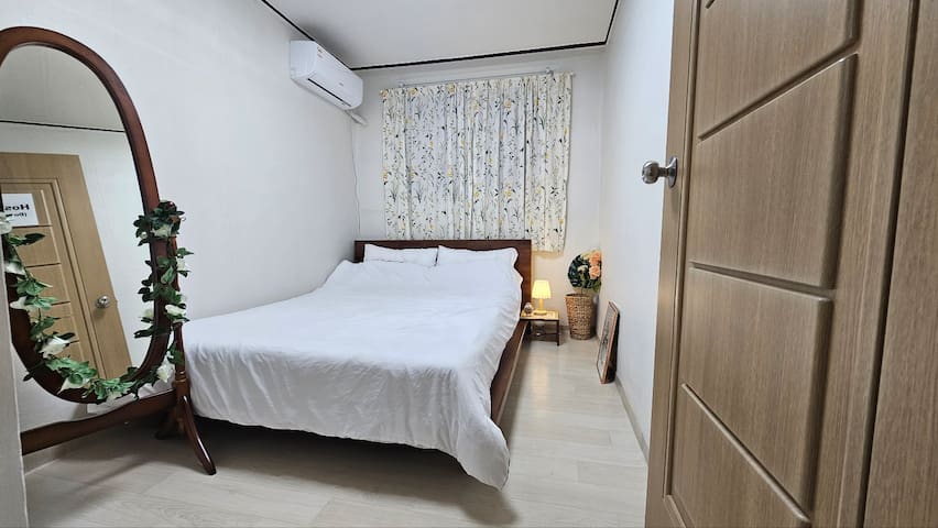 퀸사이즈 침대1개, 에어컨, 협탁, 스탠드, 멀티충전기, 전신거울과 옷걸이