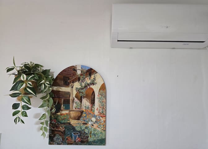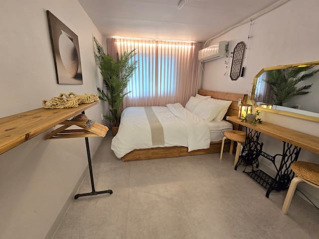 킹침대 1개,킹 매트리스 토퍼1개(4인 이상,어르신, 아이에적합),벽걸이에어컨