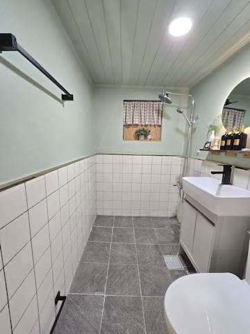해바라기샤워기,변기,세면대,수건,샤워용품(샴푸,린스,샤워젤,치약,칫솔,)