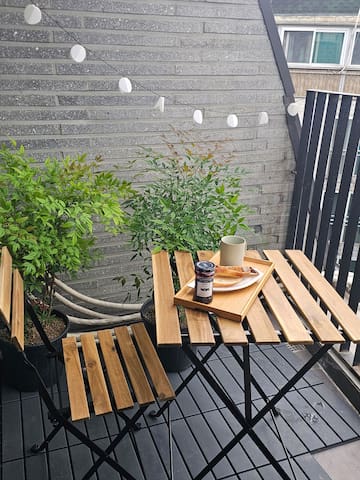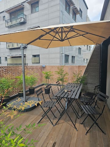 디자이너 부부에 의해 지어진 이 독특한 숙소는 개성 넘치는 스타일을 자랑합니다. 초록식물과 커다란 파라솔이 있는 도심속의 그린 테라스가... See more