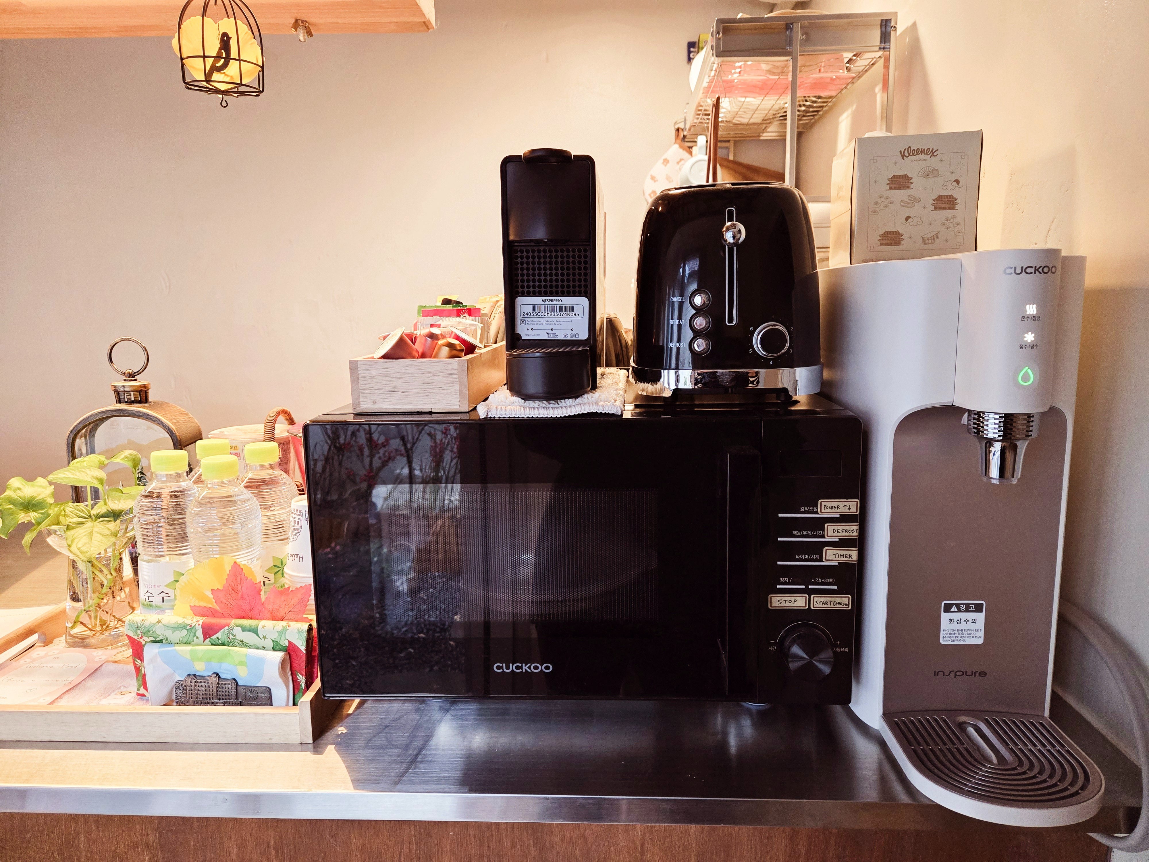 토스터, 전기 주전자, 전자레인지가 설치되어 있습니다. 티백, 인스턴트 커피, 서울 주요 관광지 안내문, KF 94 마스크, 손소독제 등을 제공합니다.