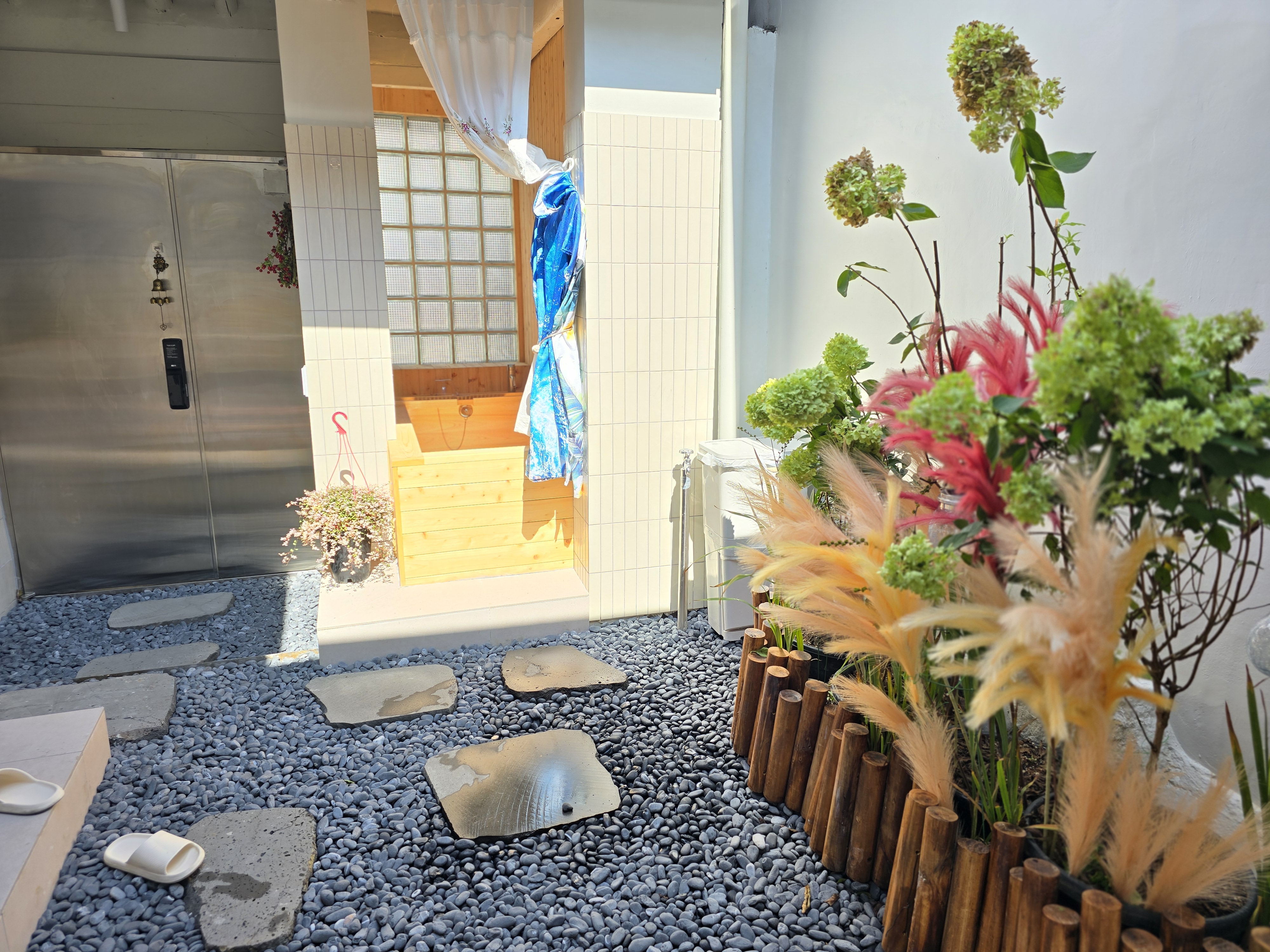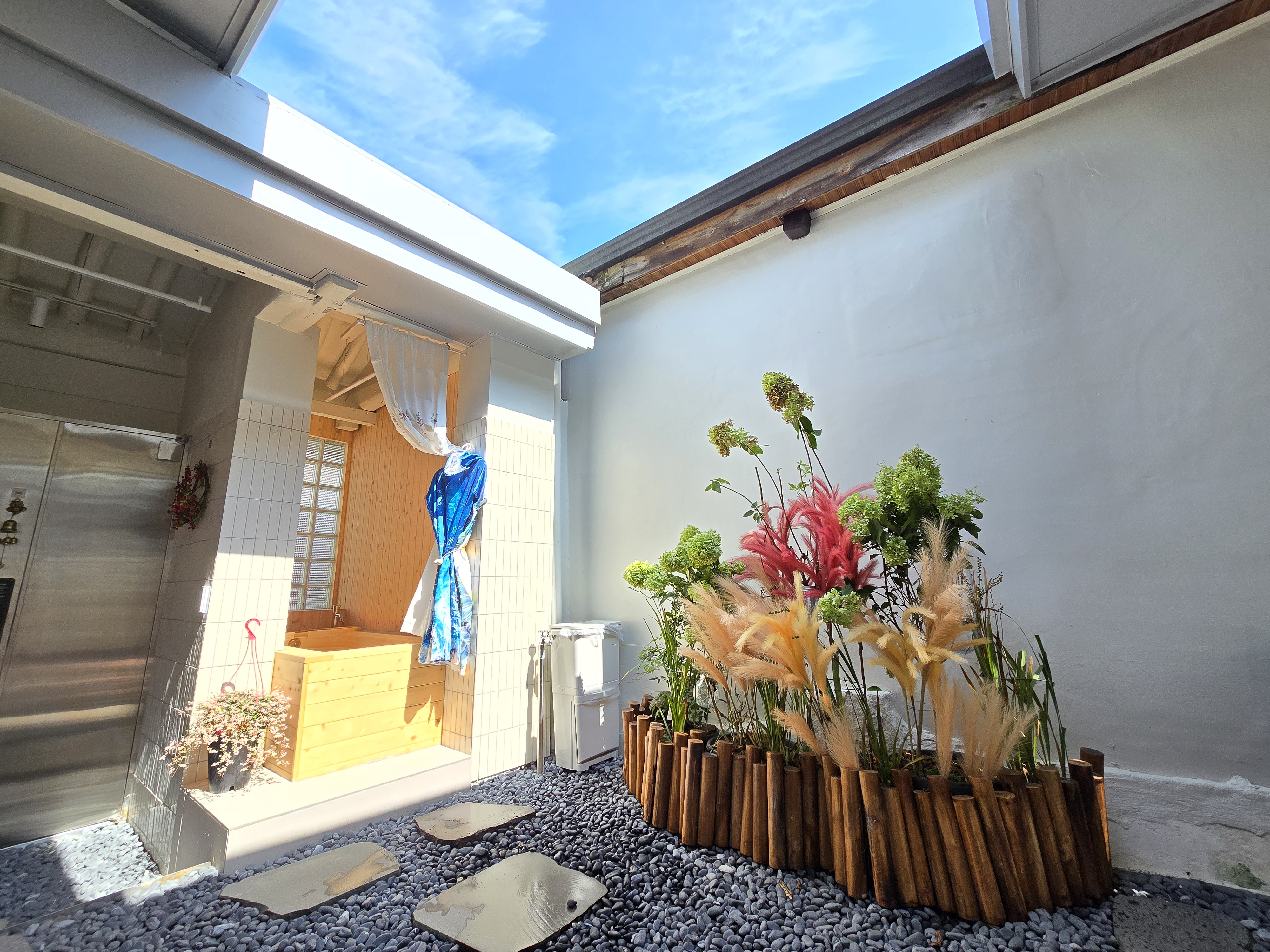 작은 마당은 하늘을 올려다보며 편백나무 욕조 자쿠지를 즐길 수 있는 곳입니다.계절에 따라 달라지는 꽃과 나무를 보면서 여행의 피로를 풀어버릴 수 있습니다.