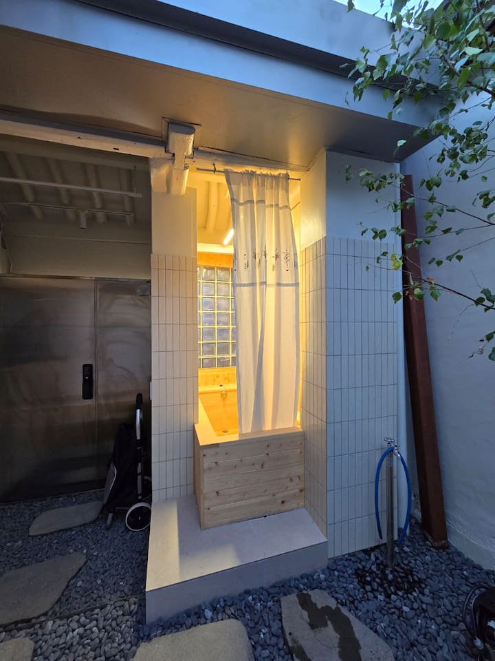 앞마당에 편백욕조가 설치돼있습니다. 피톤치드 향이 느껴지는 반신욕을 하며 여행의 피로를 씻어내세요.