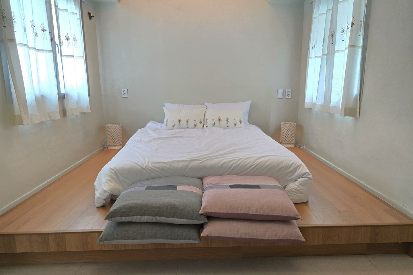 큰 방(게스트룸1) 퀸 사이즈 침대 양쪽 머리맡에 도자기로 만든 멋스러운 조명을 두었습니다. 실제로 보면 더욱 아름다운 조명을 독서등, 수면등으로 사용할 수 있습니다.