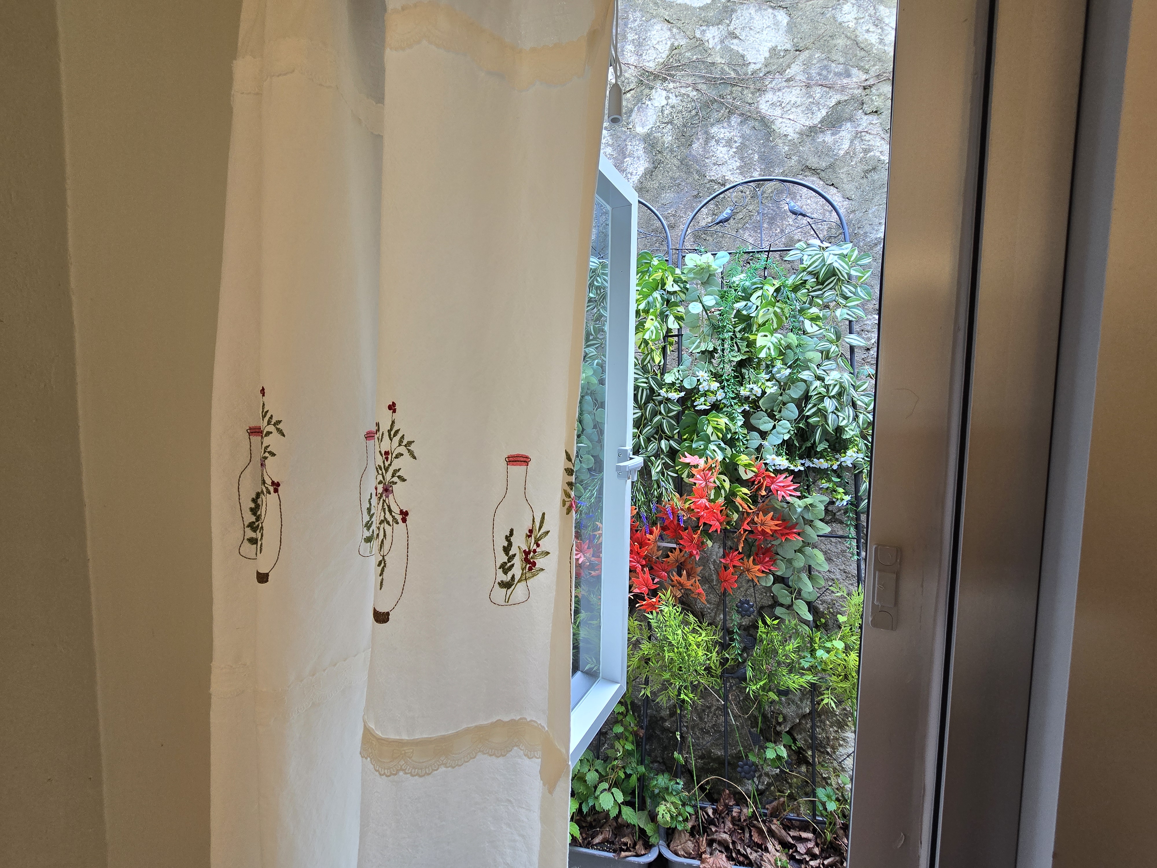 큰 방(게스트룸1)에서는 여닫이 창문을 통해 마당을 내다볼 수 있습니다. 앞쪽 창문을 통해 대문으로 들어오는 사람과 인사를 나누고, 마당의 꽃나무를 감상하거나, 편백나무 욕조에서 놀고 있는 일행과 대화를 나눌 수도 있습니다.