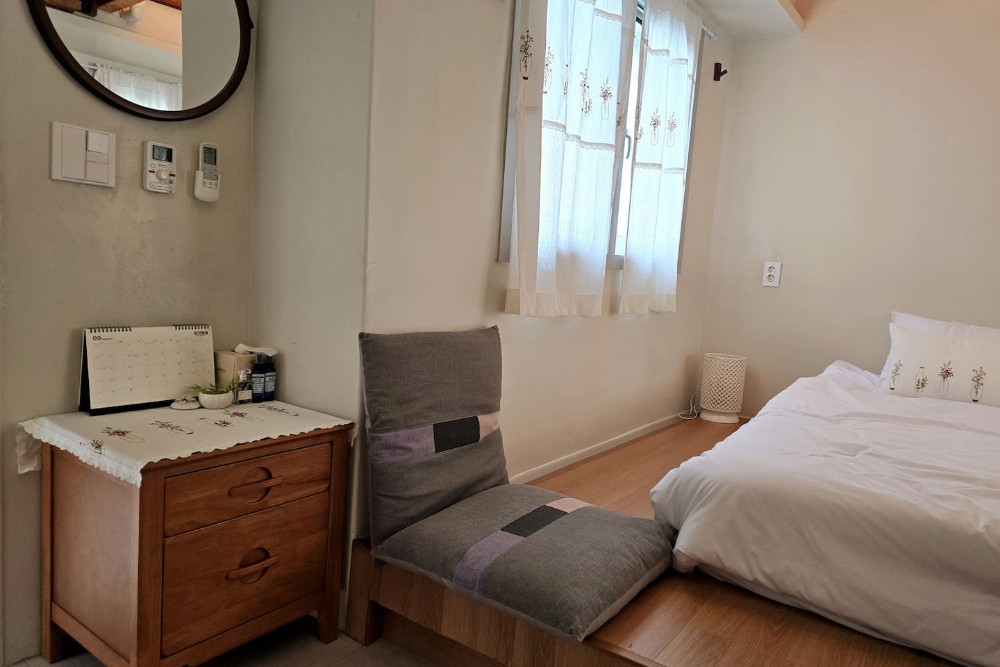 큰 방(게스트룸1)의 뒷쪽 창문은 옹벽 방향으로 나 있습니다. 앞쪽 창문과 뒷쪽 창문을 함께 열어두면 통풍이 잘 되어 항상 산뜻한 방 상태를 유지할 수 있는 환경입니다.