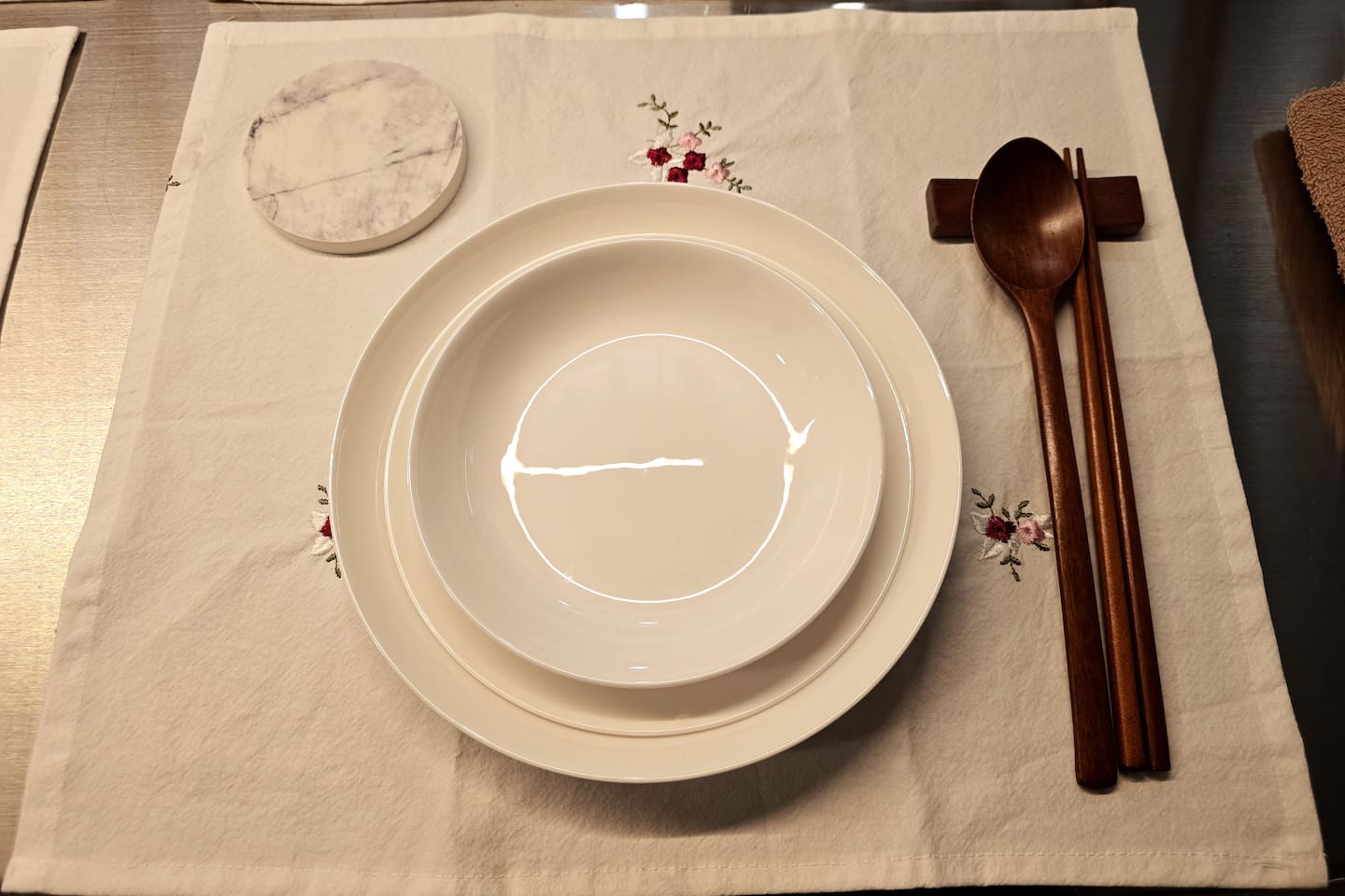 순면 수공예 테이블 매트와 나무 소재 식기가 아늑한 분위기를 줍니다.