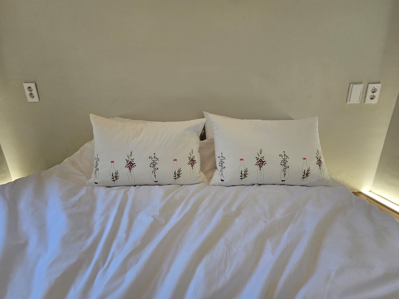 큰 방(게스트룸1)의 침대 머리맡에 설치된 조명은 하나하나 손으로 만든 수공예 도자기 제품입니다.