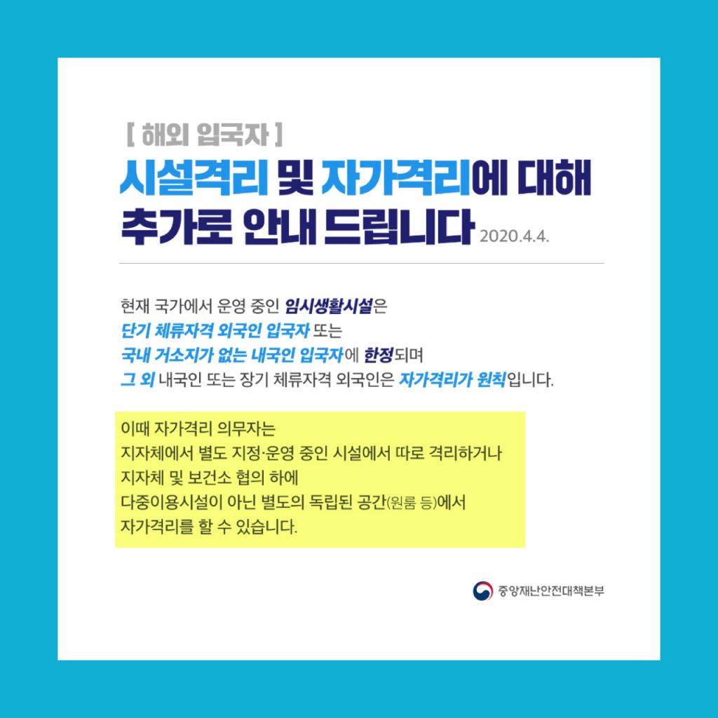 체류할 숙소의 관할 보건소에서 자가격리 관리를 받게 됩니다. 한국주소는 실 거주지가 아니여도 가능하며, 자가격리시 이용할 숙소주소를 상세하게 적어주시면 되십니다.