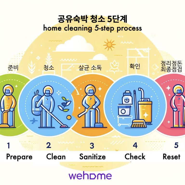 5단계 청소 절차는 한국의 해당 관련 법규 및 가이드라인과 더불어 모든 호스트가 매 숙박 전후에 반드시 따라야 하는 절차입니다.